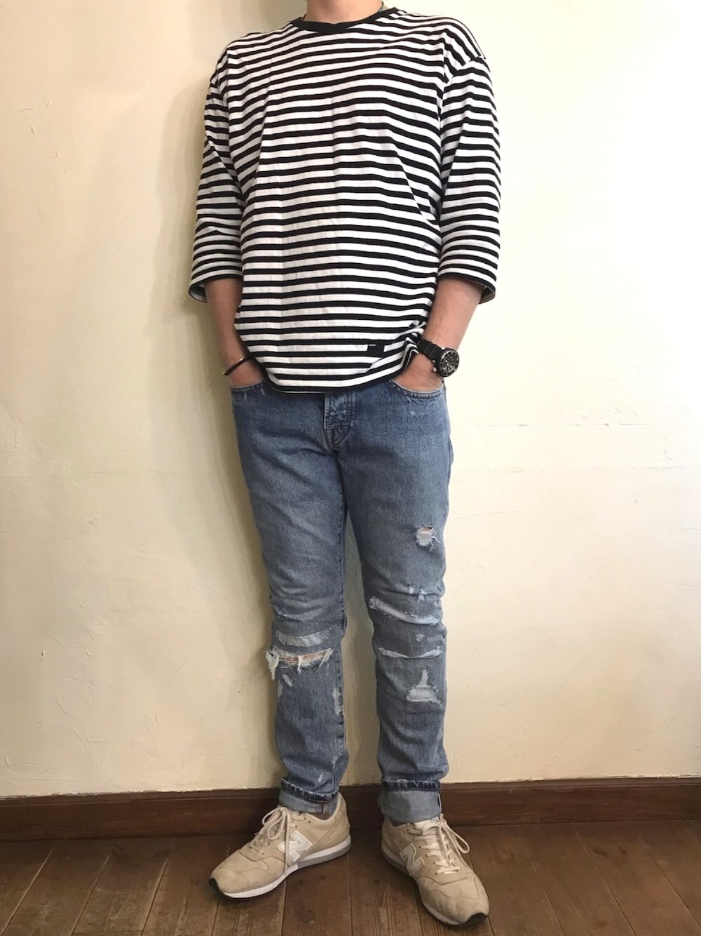 誰でも似合う、ブラックボーダー&ダメージデニムスタイル! The best combination👍