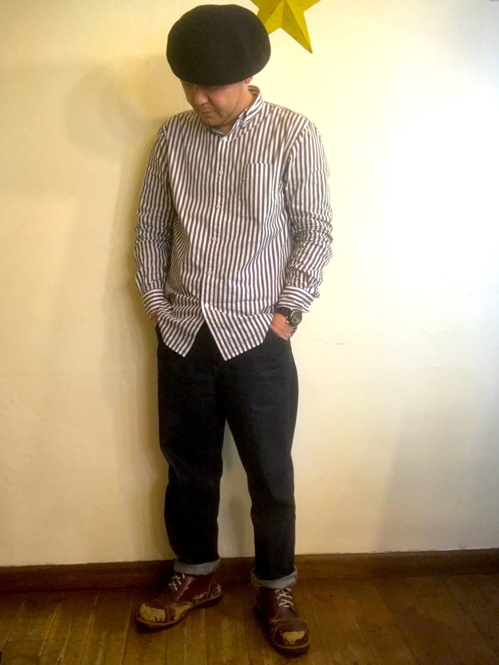 白茶のストラップシャツ ワイドテーパードデニム 頭は黒ベレー 靴はチェリーBのゲッタグリップ 10ホールブーツ