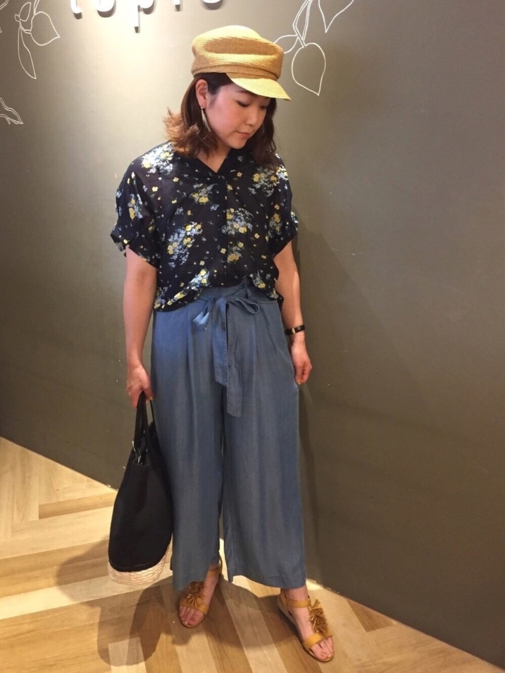 透け感のある花柄のシャツ😌 うっすらストライプが入ってます✨ イエローの花がプリントされてるのでフリンジサンダルをイエローで合わせてみました‼️ デニムもテロっとした素材なのでカジュアルになり過ぎずに使えますよ〜💕