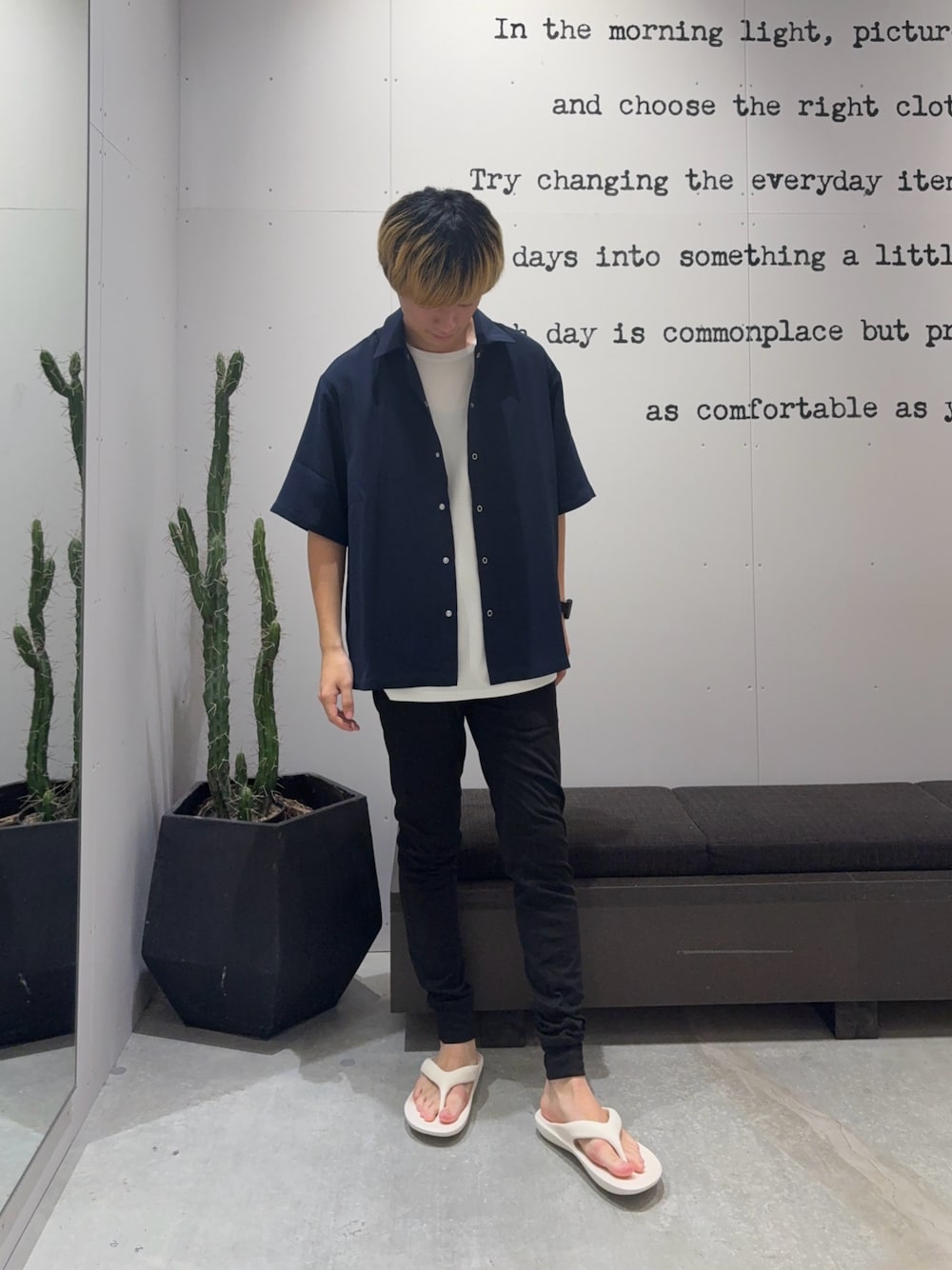 【シャツ】着用サイズ:M ワッシャー加工が施された生地を使用した半袖シャツです。 ダブルフェイス(WFACE)仕様により表と裏で異なる表面感で、表側は独特の風合いとシワ感が特徴でこれによりカジュアルながらも上品な印象を与えるデザインとなっております。 伸縮性に加え、しなやかな肌触りと優れた通気性を両立し、夏場でも快適に着用していただけます。 スナップボタンを採用することで、通常のシャツよりもリラックス感が出て着脱もスムーズに行えるようになっております。 また、スナップボタンがクリーンな印象に見えるので、サッと織るだけで大人な印象になります。 【ボトム】着用サイズ:M 4WAY (縦・横・斜め)全方向に伸縮するストレッチ素材を使用し、オンオフ問わず穿けストレスフリーな穿き心地となっております。 ちょっとした運動にも穿けるほどのストレッチ性に、ウエストゴムと紐でストレスフリーな穿き心地でオンオフ問わずに穿いていただけます。 ピタッとしたフィット感がありつつも伸縮性があり動きやすくなっております。 【サンダル】着用サイズ:XL シンプルなデザインでカジュアルなコーデはもちろん、幅広いコーデに合わせやすい一足。 軽くて足にフィットしやすく、クッション性が高いソールで歩きやすい形になっているので足運びがしやすい◎ 程よいボリューム感のあるフォルムでスタイルアップ効果もできます。