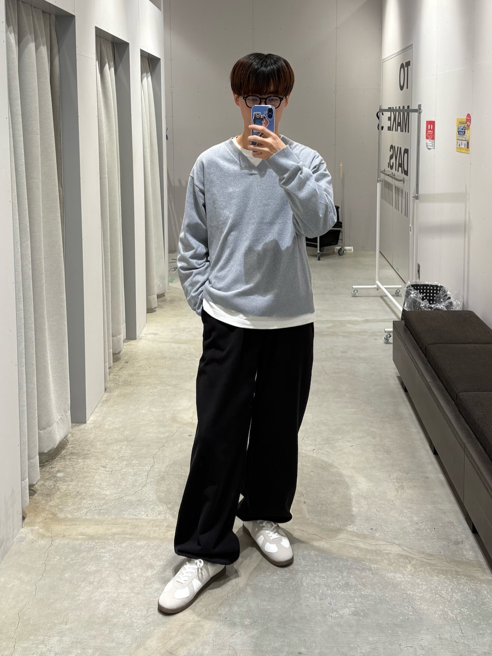 この肌触りがいいVネックのニットは着回し抜群で、デニムやスラックス、スウェットなど相性は最高です。 今回はスウェットと合わせてみました。 メガネもかけてキレイめの中にスウェットのラフな感じを掛け合わせたコーディネートです。