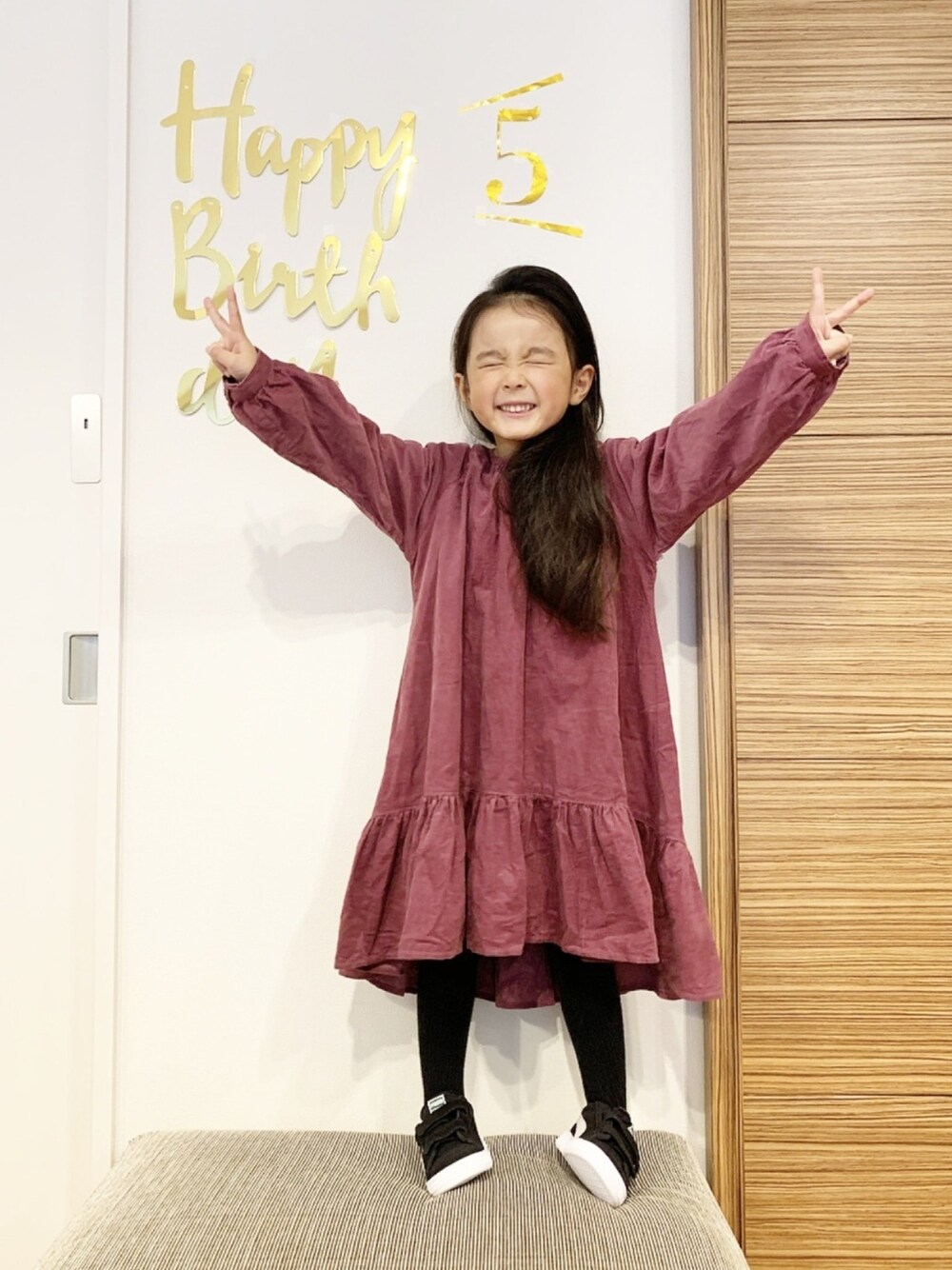 おはようございます😌 昨日誕生日でした🎂 お気に入りのワンピースで💟 祝5歳、ウインクしてポーズ決めるようになりました😂笑 楽しい1年になりますように☺️💓💓