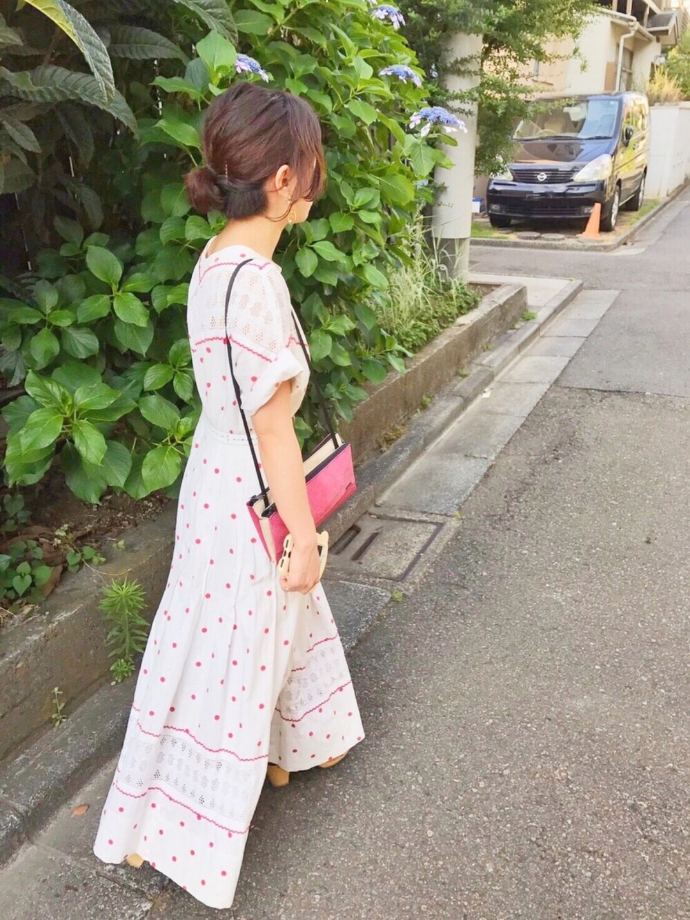 ホワイト系のワンピース、レッド系のショルダーバッグ、ブラウン系のサンダルを着用したレディースの夏コーディネートの1枚目の写真