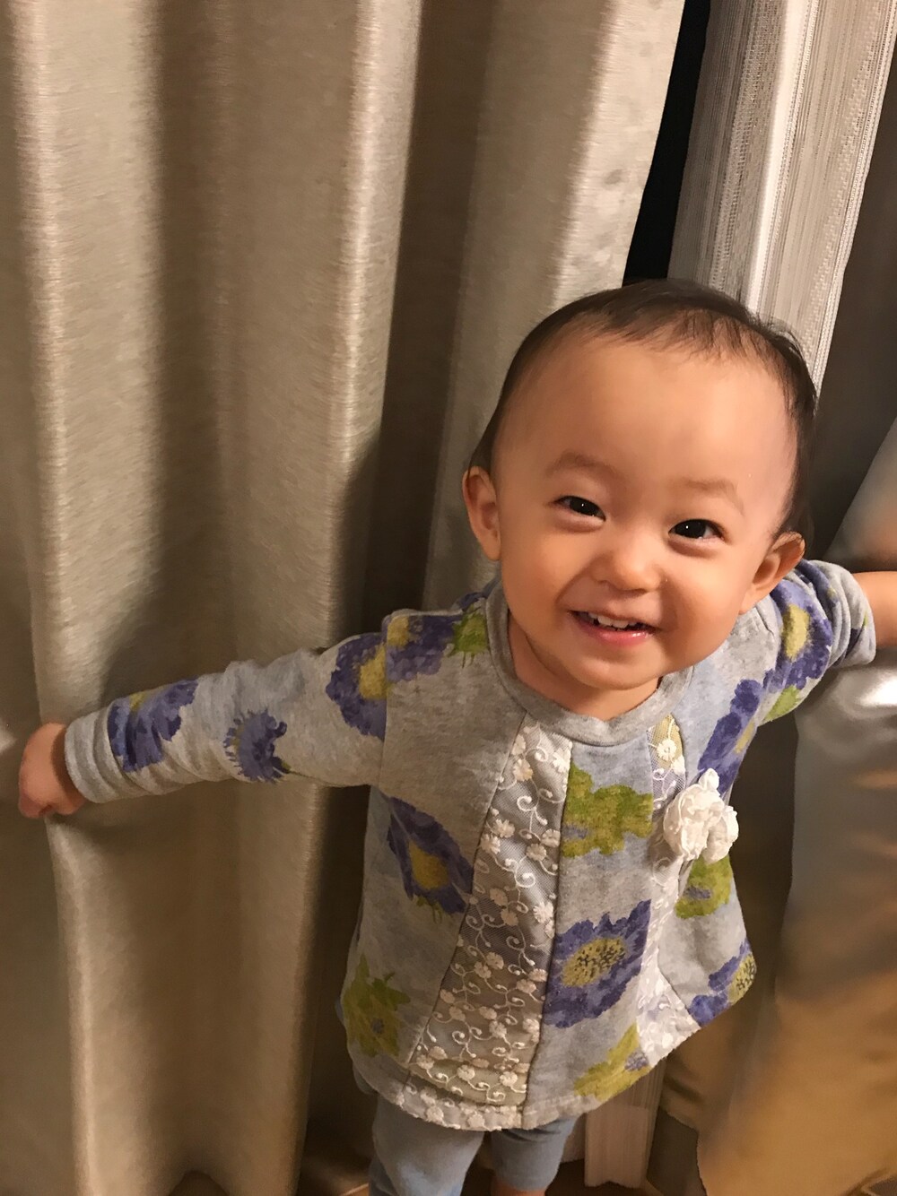 去年の誕生日に母から頂いたハッカベビーとカットソー。 裏起毛で温かく、デザインが可愛くて気に入ってます。 着ていくと、可愛いねと褒められます💕 1年9ヶ月で髪の毛は前より増えました。 女の子だし、もう少し前髪が欲しいなぁ 笑っ 最近はキラキラした物が大好き✨ クリスマスツリーを見つけると大喜びしてます。 ママのアクセサリーも大好きで勝手に出そうとするので、手の届かない所に隠してます。手前にキーホルダーとか置いて誤魔化す日々です 笑っ この写真は、家のカーテンで『いないいないばあ♪』と言って可愛く遊んでいる時の笑顔が可愛くて撮りました。