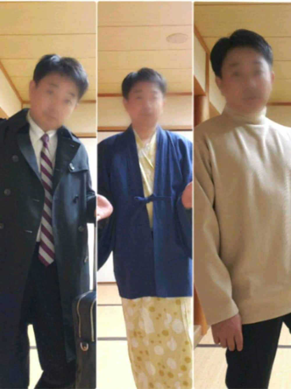 いつも大したことないコーデですが見てくれてありがとうございます🍀 出張3日目となると疲れがピーク~なんとかやってます✨ ~👕👔タヌキの3変化👘🍀~ →チェックイン🔑後 →着替えて🎽↔️👕からごはん🍚前 →ホテルの浴衣 特にポイントはないけど、気持ちを切り替える為には先ずは服装-身だしなみから✨ スーツでも私服でも浴衣でも、部屋でやってることって変わらないけどー(^_^;) きっとX'masでも変わらないです🍀 この後も健やかにお過ごしください🍀
