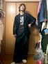 穴が開くほどボロボロの古着Teeをインナーに入れて、ダークトーンでまとめつつロゴの文字とスニーカーの白をワンポイント差し込んだコーデ。