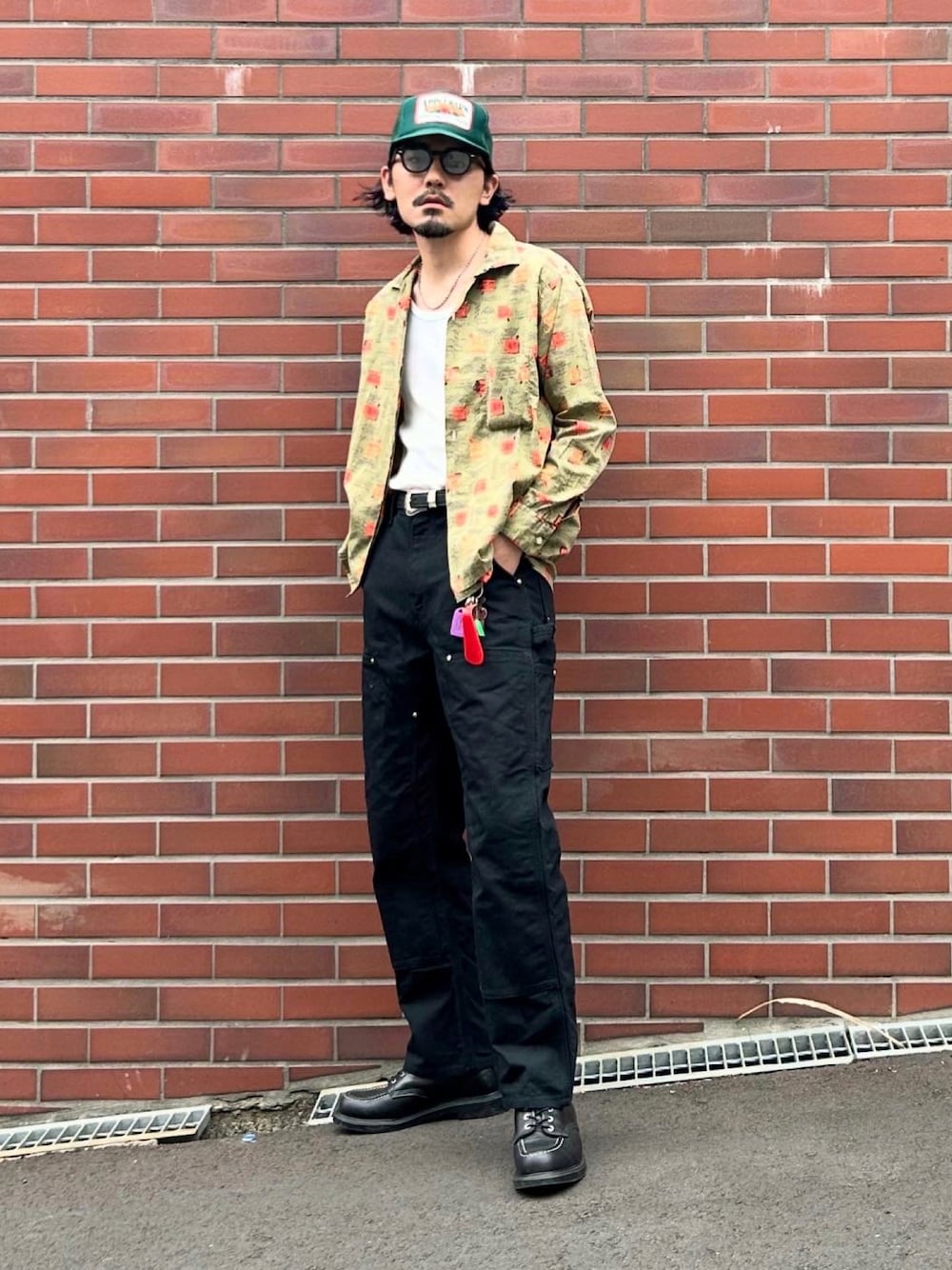 たぶん60年代頃かと思われる総柄オープンカラーシャツ。 色合いは地味ですが何の柄かわからないし主張が激しいので、とりあえずいつも通りな感じで。 shirt:60's Penny's inner:50's Pilgrim pants:Carhartt boots:RED WING cap:90's brand unknown glasses:JULIUS TART OPTICAL belt:TORY LEATHER accessories:CHROME HEARTS socks:RoToTo