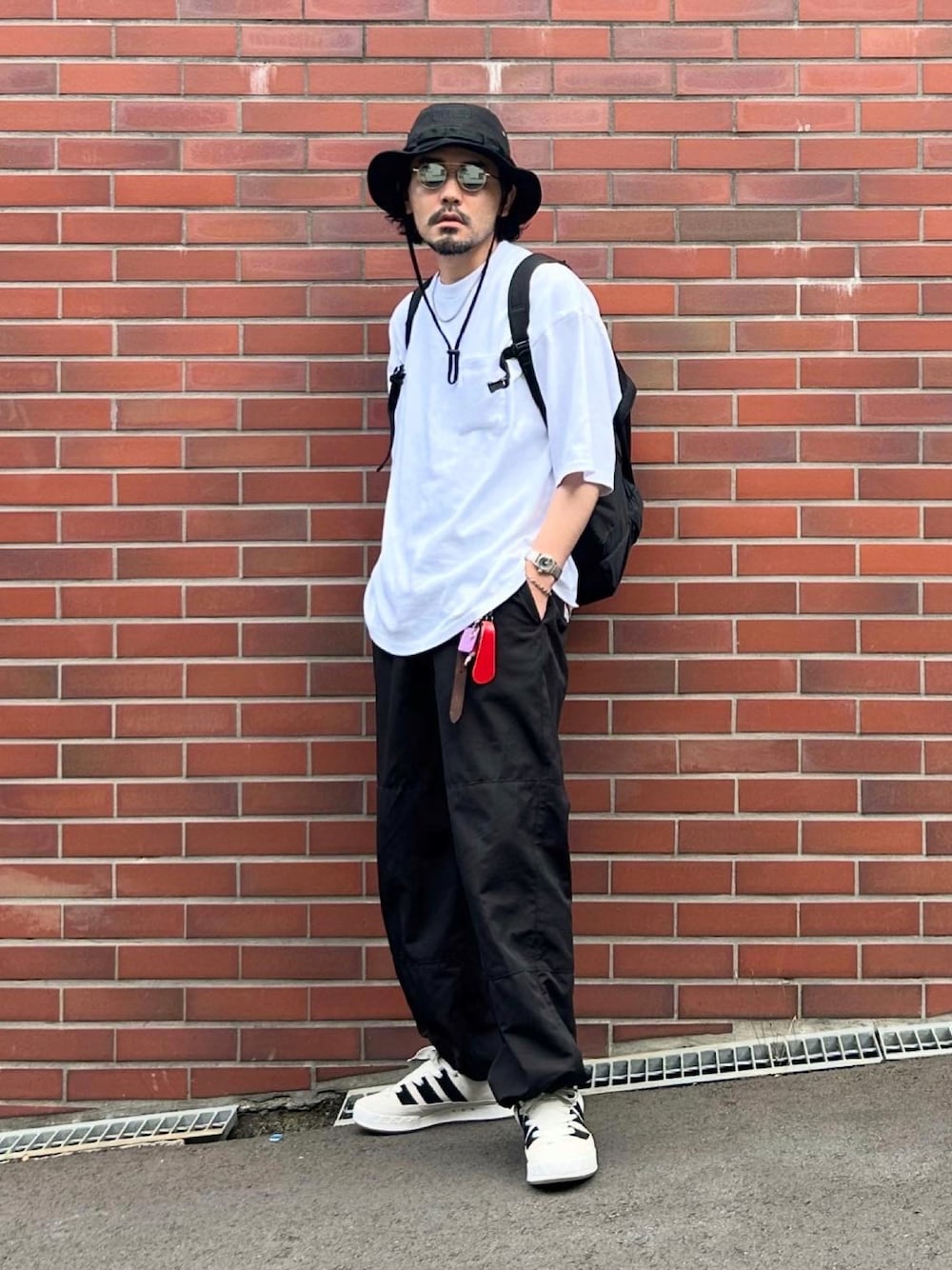 ビッグTにシャカパン、スケシューの鉄板な組み合わせ。 tee:GoodWear inner:Hanes pants:BEN DAVIS shoes:adidas hat:S/DOUBLE glasses:THOM BROWNE belt:Jabez Cliff bag:bagjack