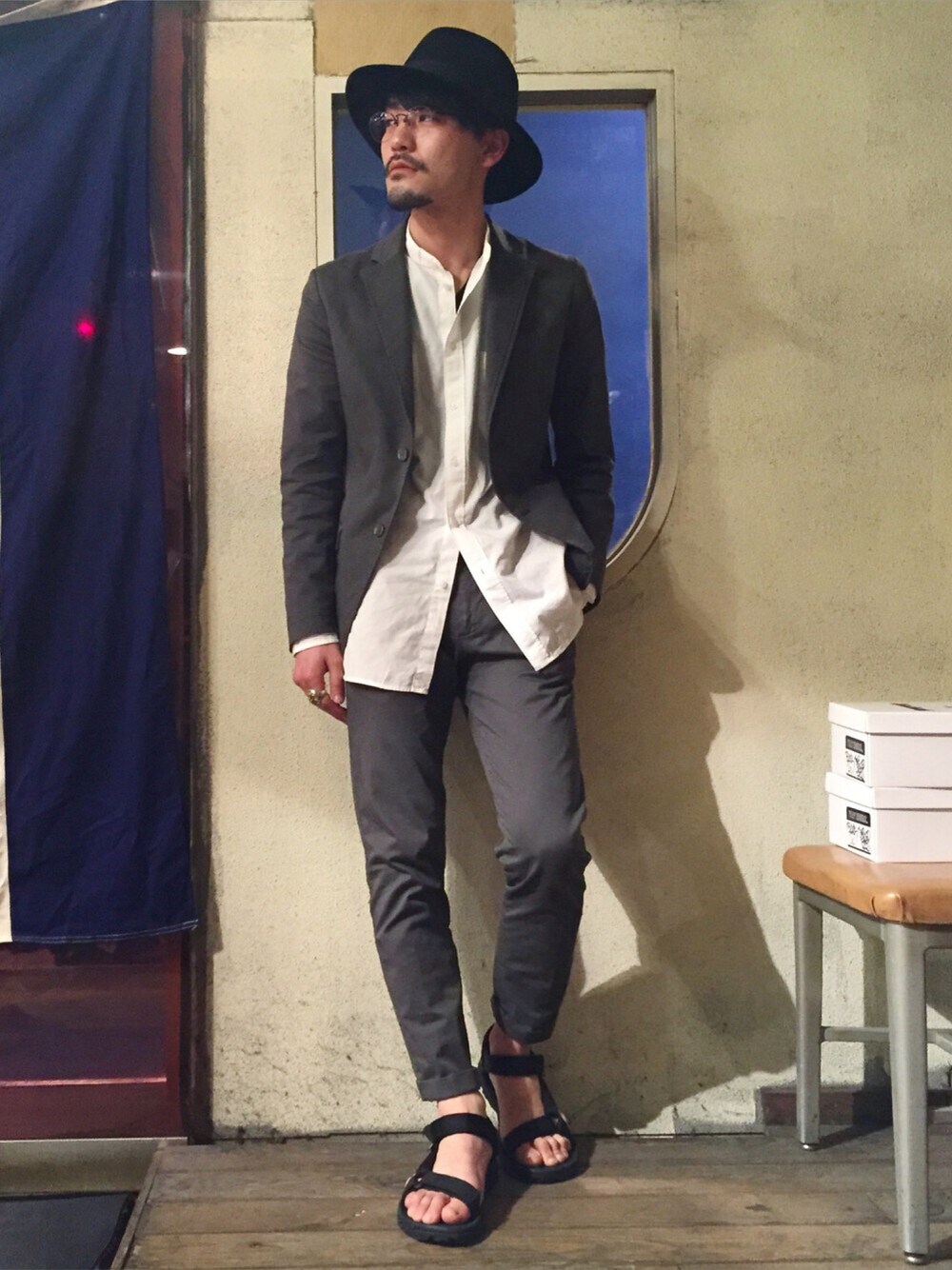 セットアップをラフに。 hat:Borsalino jacket:Marcel Lassance shirt:Universal Works pants:Marcel Lassance sandals:Teva glasses:Christian Roth