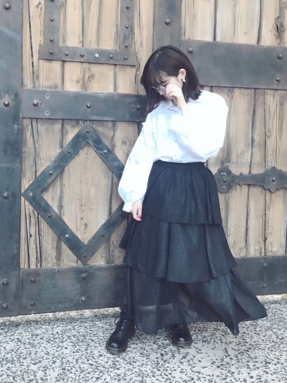 昨日ディズニーシーに行きました🐭 少しヴィランズイメージで💭 LIMI feuのボリューム袖のシャツが シンプルな色味のコーデに インパクトになります(^。^) イーハイフンのゆらちゃんコラボの スカーともいい感じにヴィランズ感 出してくれてハロウィンぴったりの コーデになりました◎