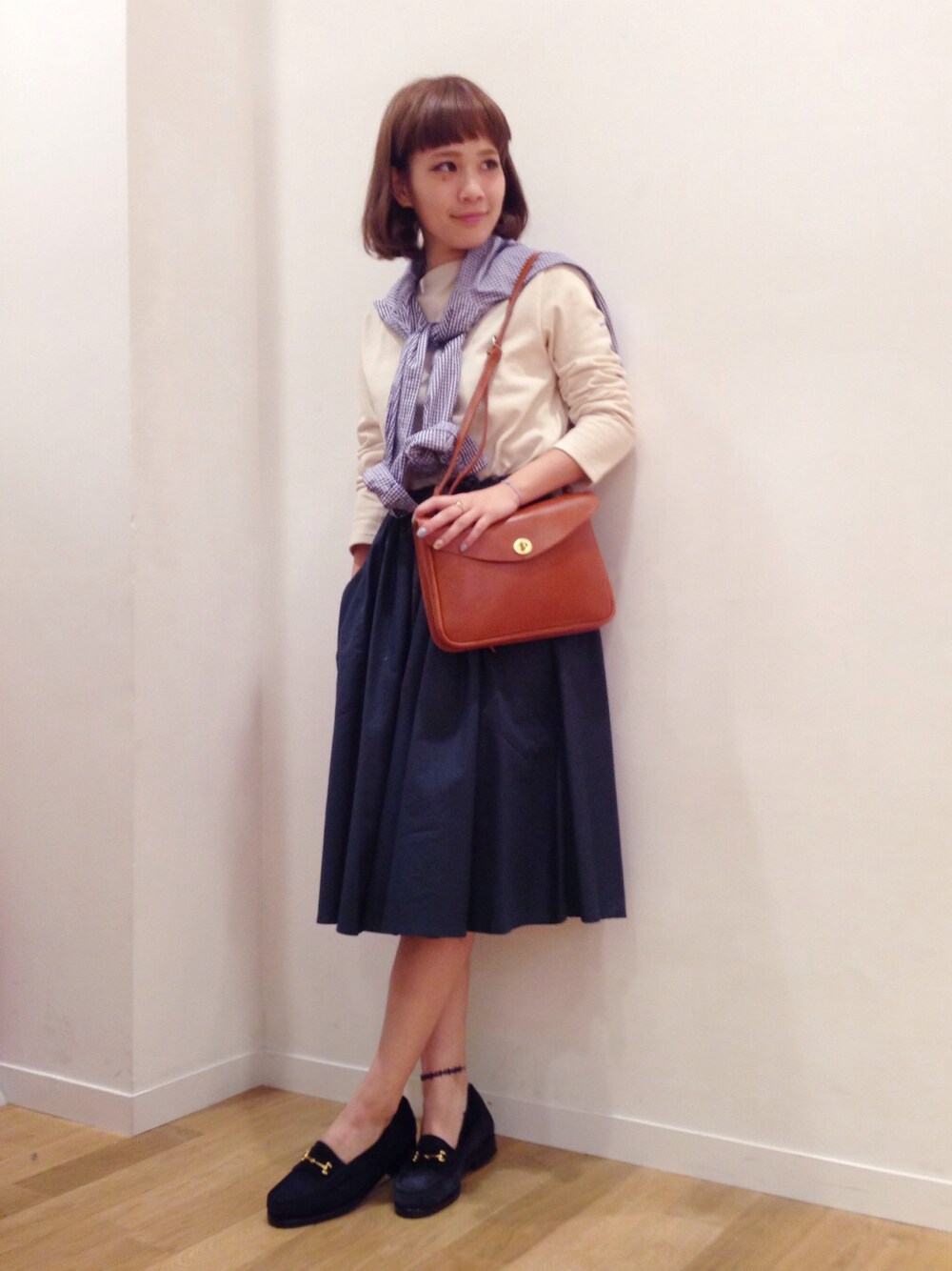 コットンのフレアスカートは 程よいボリューム感と光沢感が上品な 雰囲気を出してくれます。 薄い素材のカットソーはタックインで スッキリと。