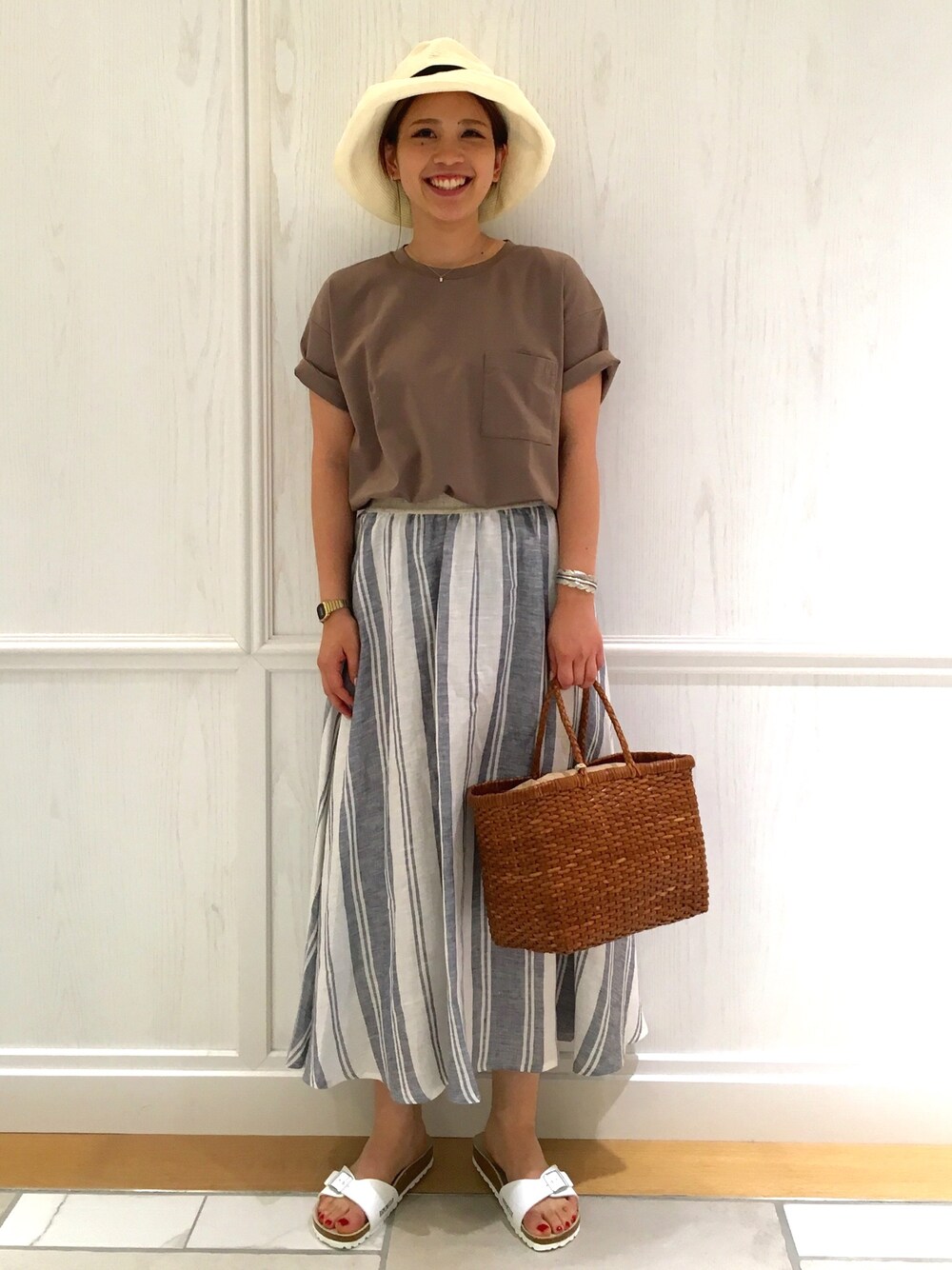 猛暑にぴったりの麻素材のロングスカートは ウエスト部分がゴムでリラックスして着ていただけます。 今年トレンドのテラコッタカラーのTシャツに合わせて大人めカジュアルコーディネートはいかがでしょうか。