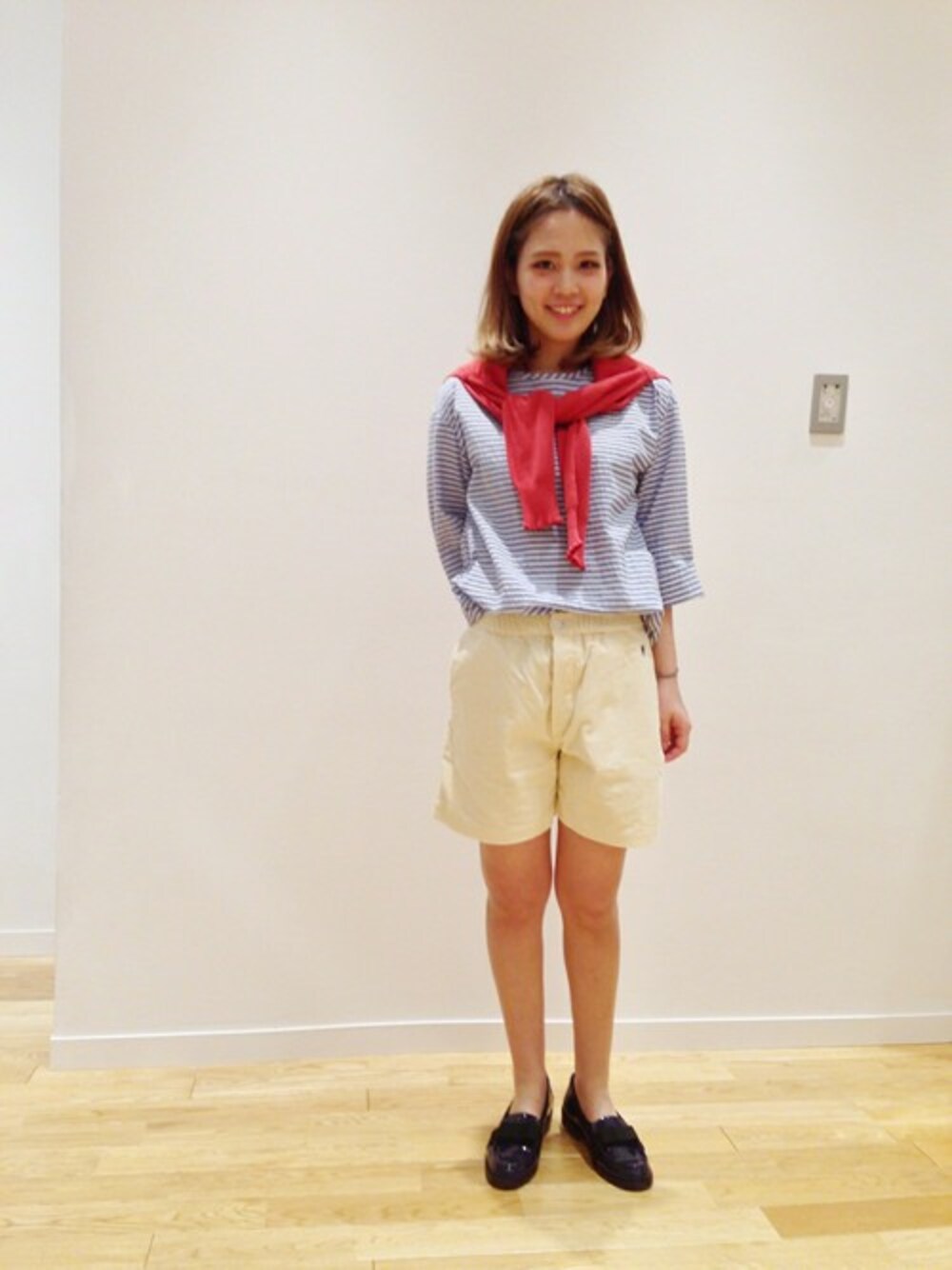 少し丈感があるトップスをあえてインし、 スタイルアップを。 爽やかな色の上下に赤のカーディガンをプラスし メリハリのあるコーディネートに仕上げました。