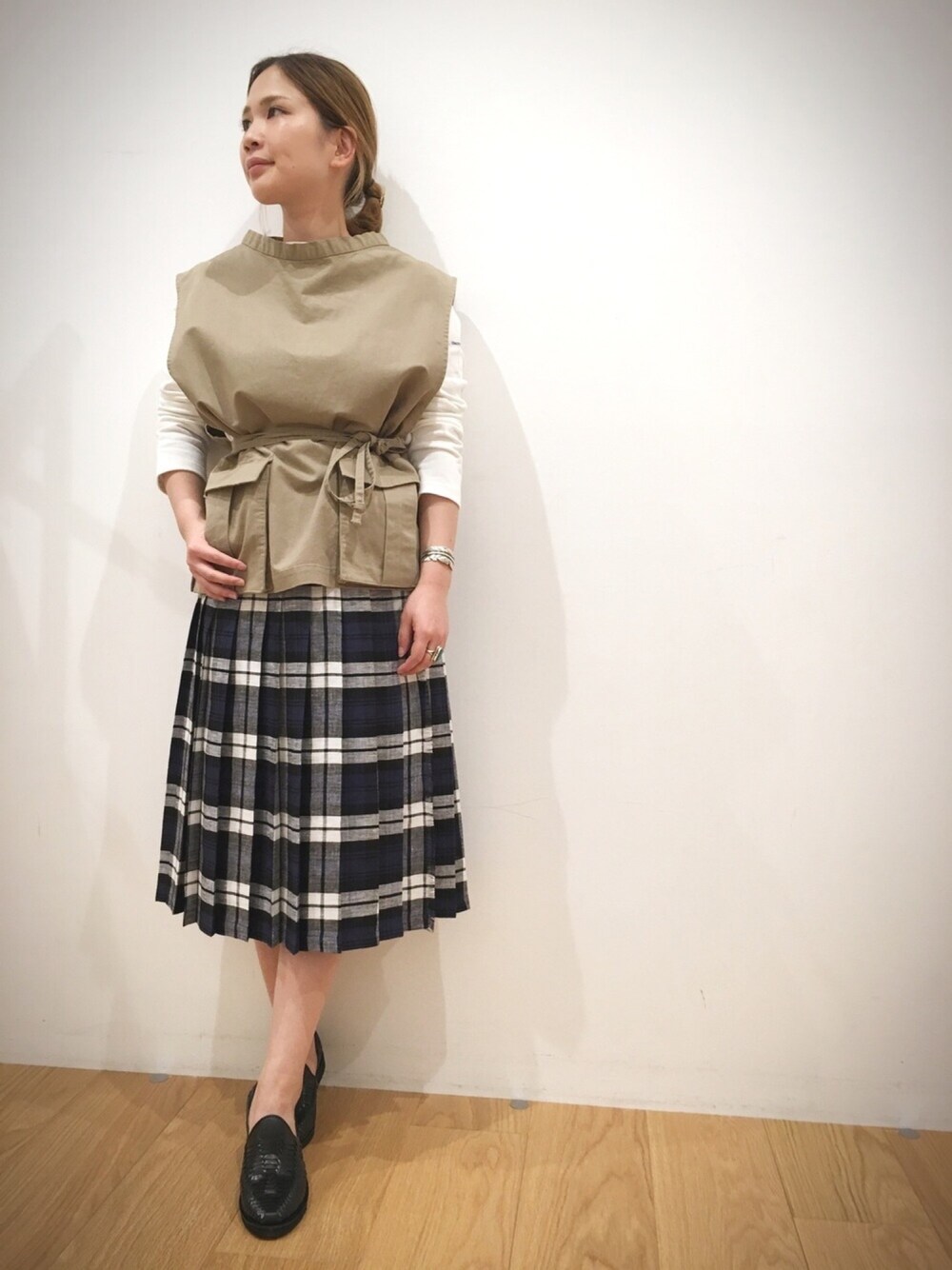 ワークテイストの強いベストは女性らしいアイテムとの組み合わせでバランスを。 ウエスト紐をしばるだけで一気にスタイルアップが叶います。 是非店頭にてご覧くださいませ。