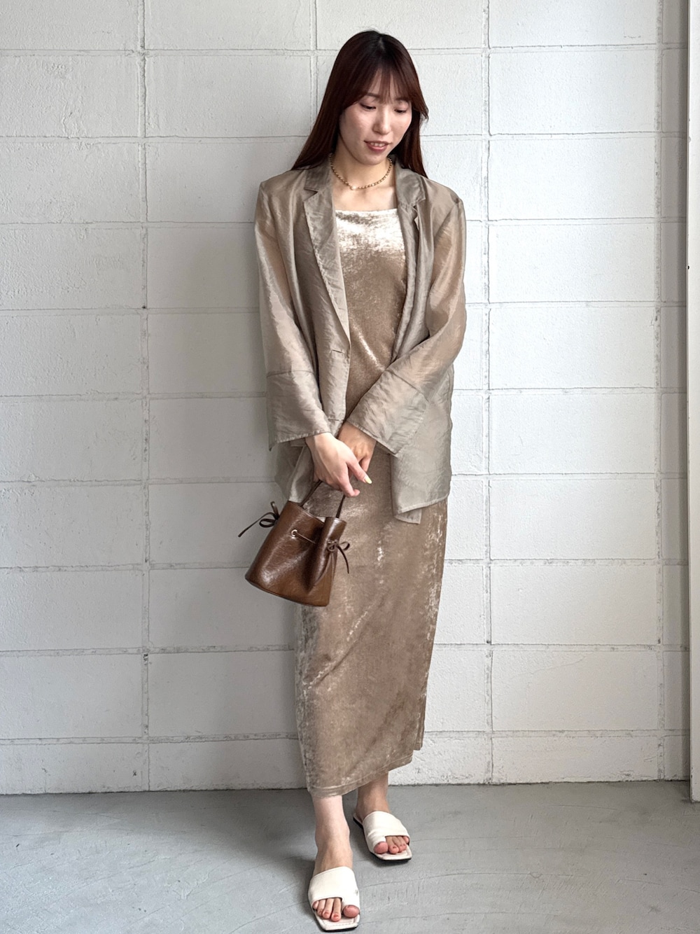 カップ付で楽ちんなシアーベロアキャミワンピース! 程よい光沢感とシアー感で、着心地は楽なのにきちんと見えして嬉しい! まだ暑いうちはオーガンジーテーラードジャケットを合わせて◎ 秋も日差しは強いので日焼け&冷房対策でもジャケットは大活躍!