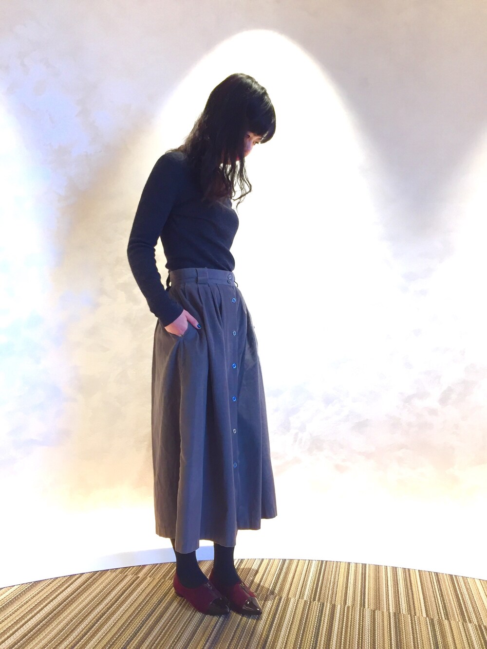 グレーのワントーンにワインレッドのパンプスを合わせました♪ 寒い日はボリュームのあるスカートがあったかい(^ω^)