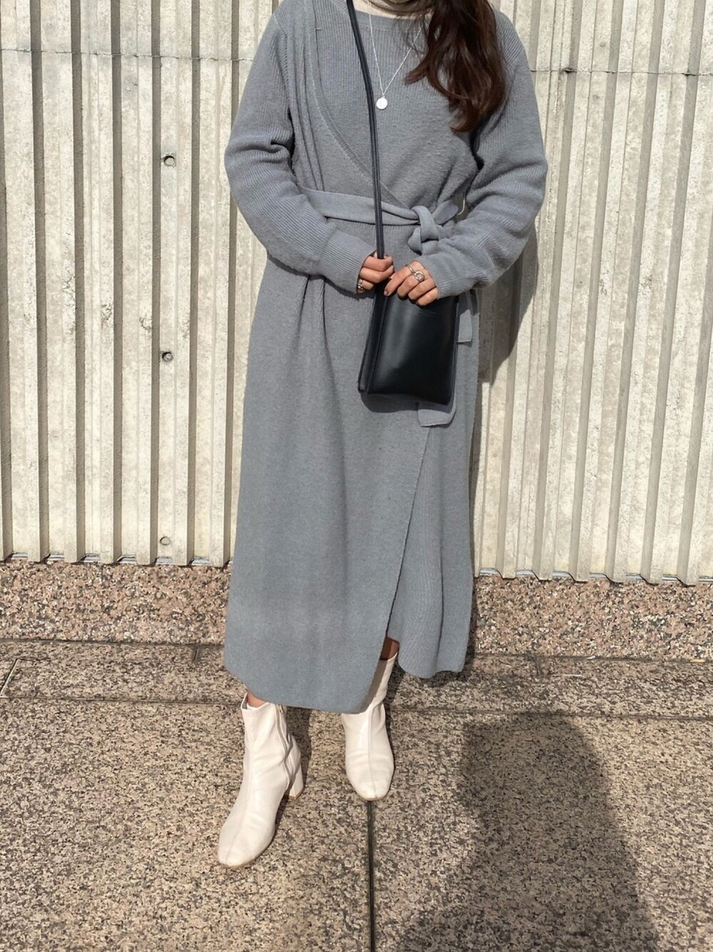 淡い色のニットワンピに、黒のバックでアクセント🍃 やっぱりワンピースが好きです☺︎