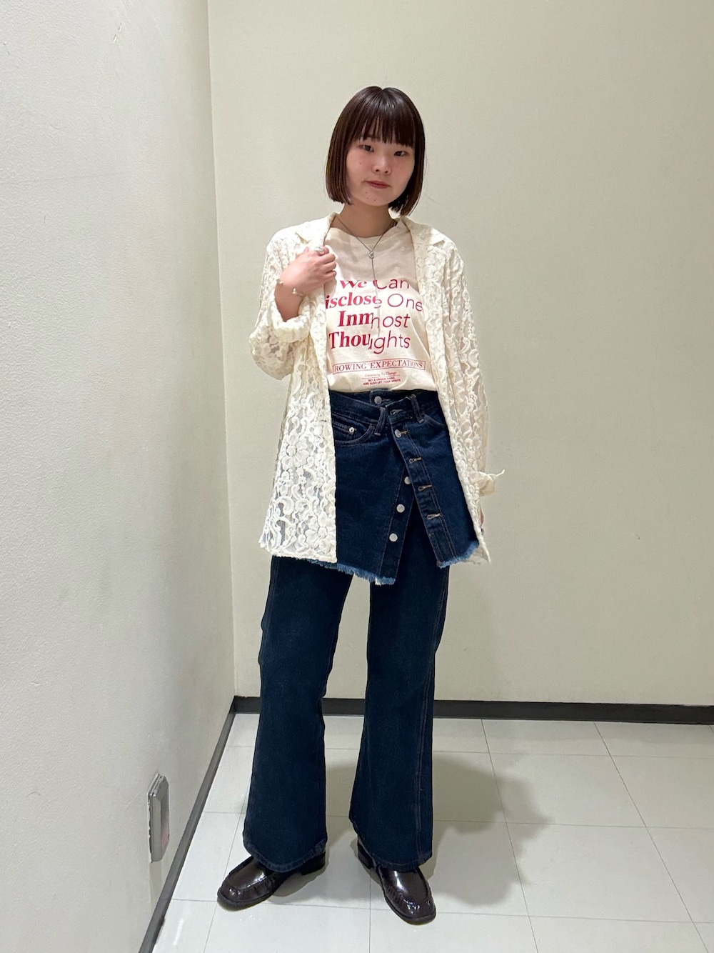 ご覧いただきましてありがとうございます♩ レースのジャケットを主役に、私らしくカジュアルに落とし込んだコーデを組んでみました✨ ロゴの書いてあるTシャツとデニムスタイルにプラスワンアイテムとして、レースジャケットを取り入れることで、上品なスタイルも叶います^^ ジャケットの肌あたりもよく、中にキャミを入れて羽織るスタイルでも着心地抜群です◎ 是非店頭でお試しくださいませ♩