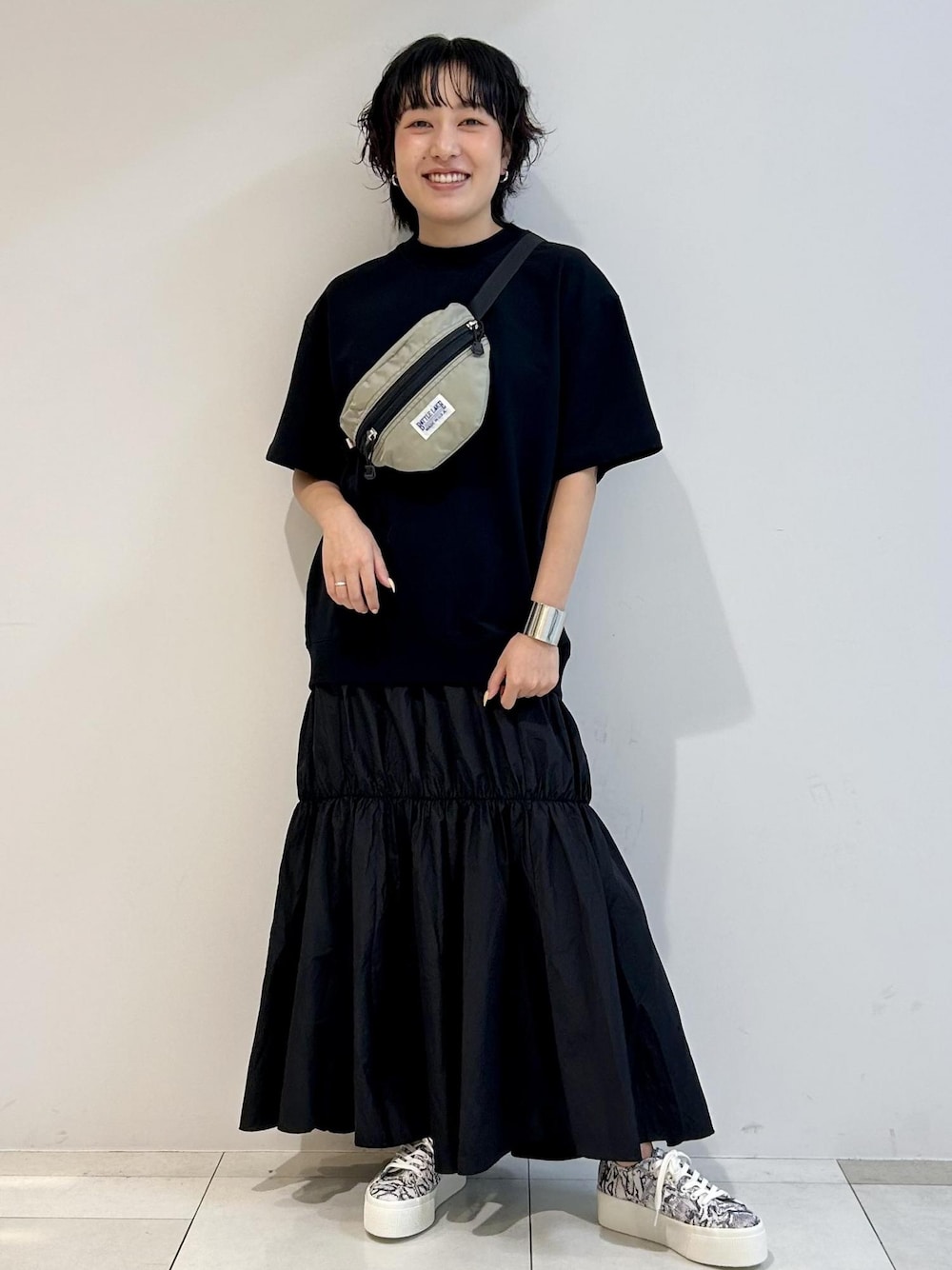 モノトーンでまとめた大人なカジュアルスタイル。 ビッグシルエットなTシャツなので 目線をあげるようボディバッグを合わせたのがこだわりポイント。 私は足首が細くてサンダルだとバランスが合わないので 厚底のスニーカーをチョイスしました。 肩幅が気になる方なども厚底の靴で合わせると◎です!