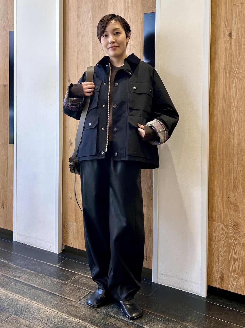 ポケットが魅力的なBarbour別注アイテム。 メンズならではの幅感、こなれて見えます☺︎ とても軽くてストレスフリー。 今の中途半端な季節から 真冬はインナーを暖かくすれば 長く着用できます。 ブラックワントーンでレザーを合わせて 異素材でお互いが良く見えるようにスタイリングしてみました。
