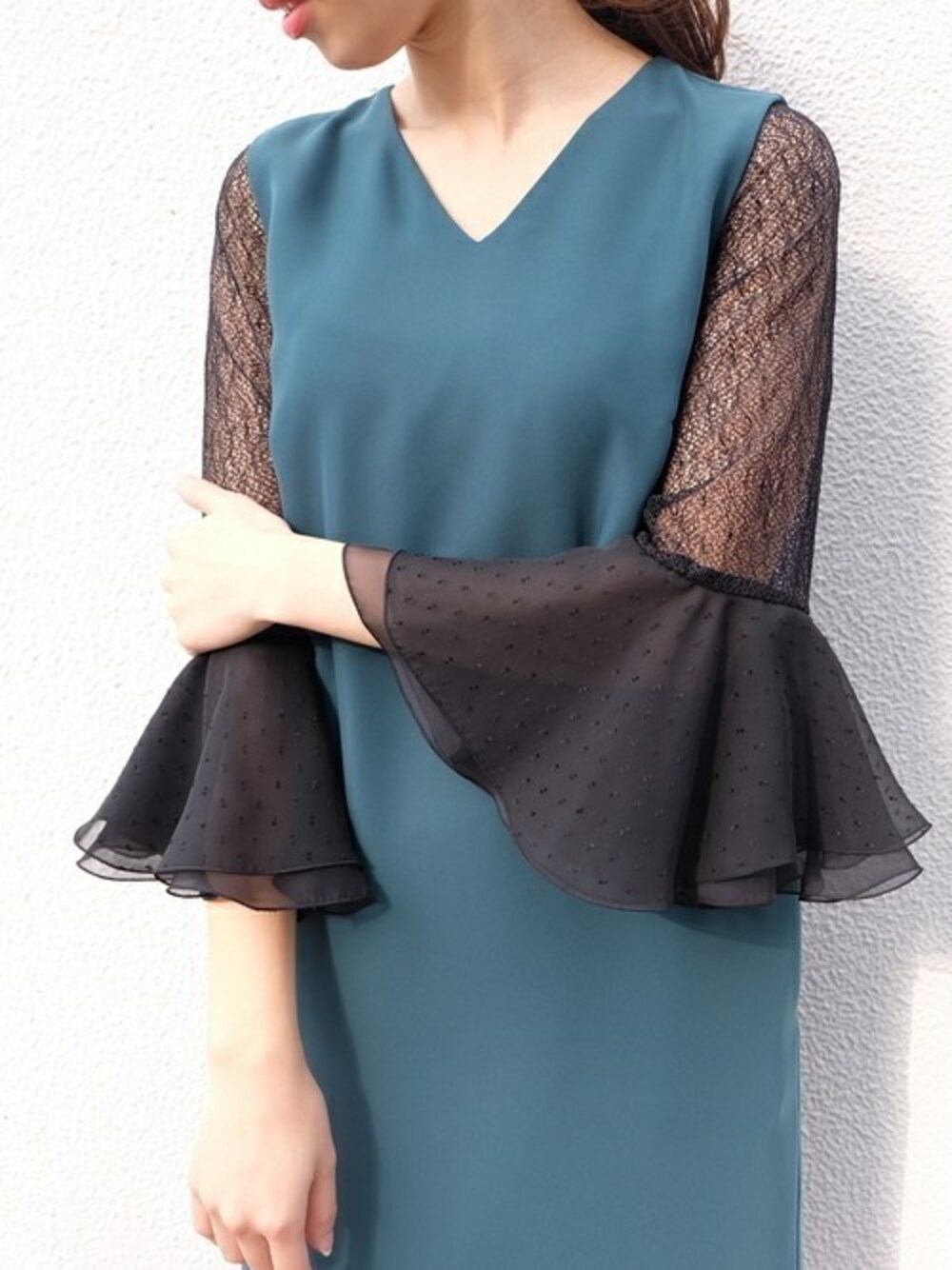 kaeneSTAFFのドレス「異素材MIXフレア袖ワンピース」を使ったコーディネート