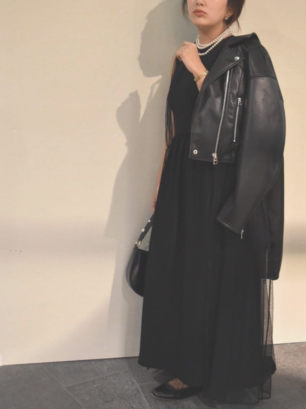 シンプルかつ美シルエットのウエストギャザーマキシワンピースに、エプロンチュールワンピースをジレのように羽織り、コーディネートしました。アクセやバックはパール系で統一し、オールブラックのフォーマルコーディネートが完成。よりフォーマル感を出したければ、ヒールを合わせるのも◎