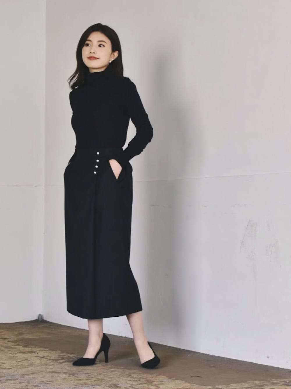 ◆モデル身長 160cm ◆着用サイズ 36 深めのタックの上にパールボタンをあしらったタックスカート。 長めの着丈とコクーンがかったシルエットでトレンド要素を取り入れました。 レーヨン混のポリエステル素材は肌触りが良くしなやかな着心地で、同素材のブラウスと合わせることで入学式・卒業式などのフォーマルシーンはもちろん、通勤やオフィスシーンにもお使いいただけます。 肌映りのいいグレージュ、 清楚感のあるネイビーの2色展開です。 ◇備考 後ろウエストゴム ◇セットアップ対応 パールピン付きブラウス(店舗品番:010408)