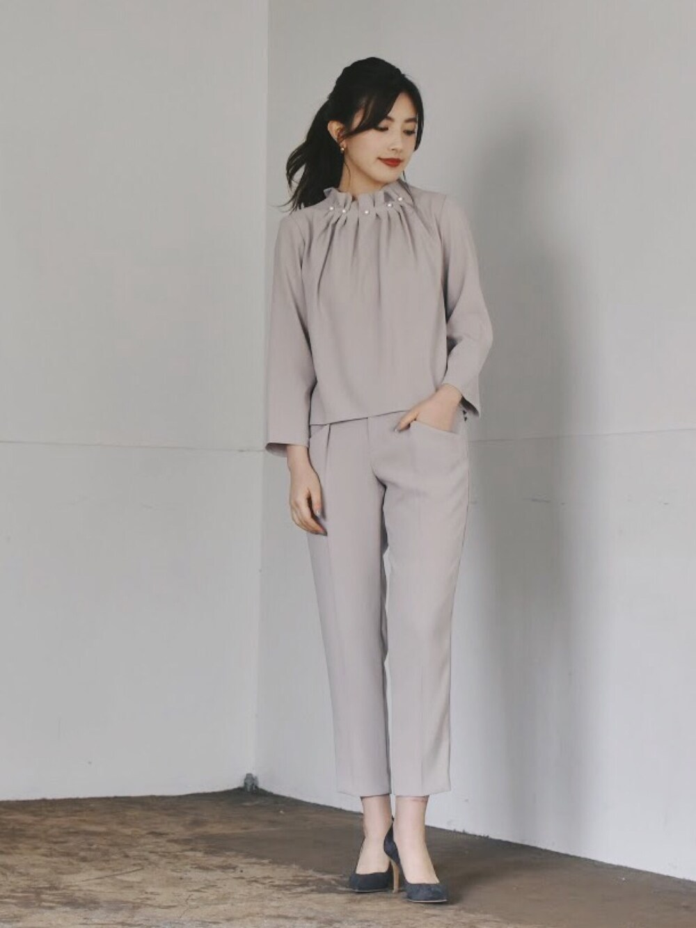 ◆モデル身長160cm ◆着用サイズ 36 少し立ち上がった襟元にパールボタンをあしらった、 上品かつ少しモード感も意識したブラウス。 + 履き心地やシルエットに定評のあるkaeneのパンツ。 ウエストにはさりげなくパールボタンを施し、トップスをインした時のポイントになります。 結婚式・お食事会などのパーティーシーンはもちろん、卒園式・卒業式・入園式・入学式などのセレモニーシーンにも使える重宝する1枚です。