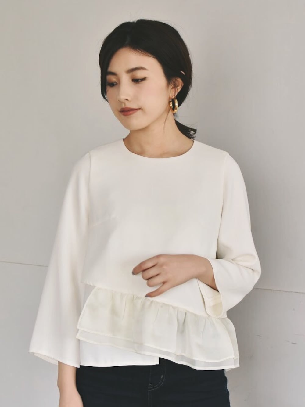 ◆モデル身長160cm ◆着用サイズ 1 アシンメトリーについたペプラムはさりげなく異素材で組み合わせ、パンツに合わせやすいシンプルなデザインに仕上げました。 ウエスト周りにボリュームがあるので、おなか周りのカバーにも◎ 落ち着いた色味のボトムと合わせれば、入卒式などのフォーマルシーンにもぴったりです。 ボトムを変えることで、普段使いやビジネスシーンでも着用していただけます。 ◇サイズについて 1=34~36サイズ (XS~S) 2=36~38サイズ (S~M) ◇備考 後ろファスナーで着脱 コーディネートしている「フリルパンツ(品番:008185)」とは生地は異なります