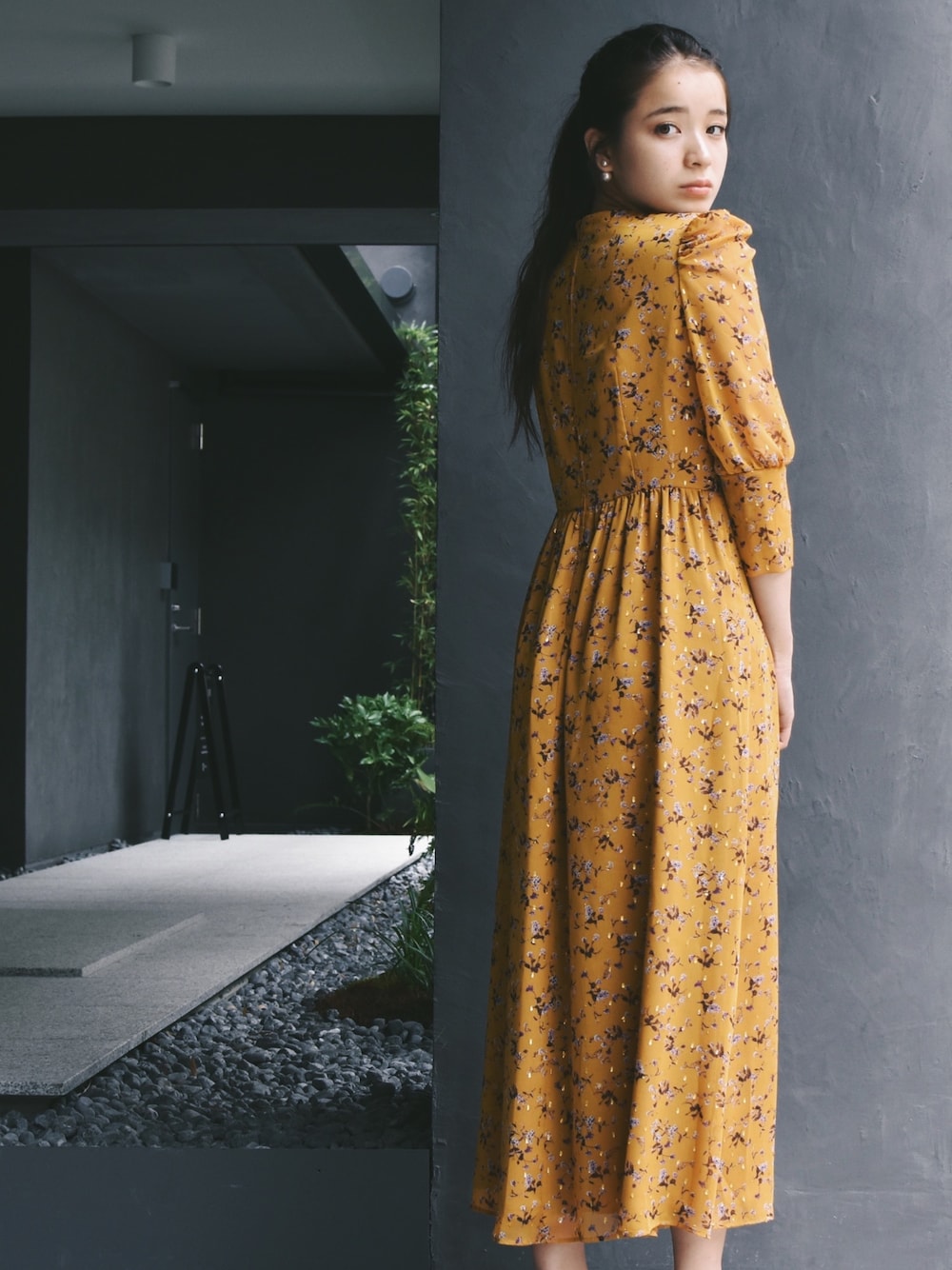 ◆モデル身長164cm ◆着用サイズ 38 ゴールドのラメドビー生地にヴィンテージ感のある小花プリントをした、華やかなワンピース。 袖のたっぷりとしたギャザーがポイントです。 普段のお出かけやお食事などでも着用しやすい、華やかすぎない絶妙なラメ感です。 結婚式のお呼ばれやパーティーシーンにもおすすめです。