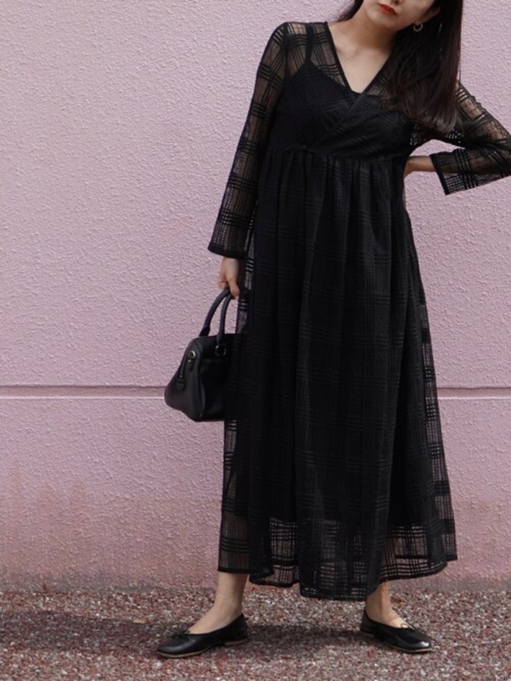 kaeneSTAFFのワンピース「チェックレースカシュクールワンピース」を使ったコーディネート