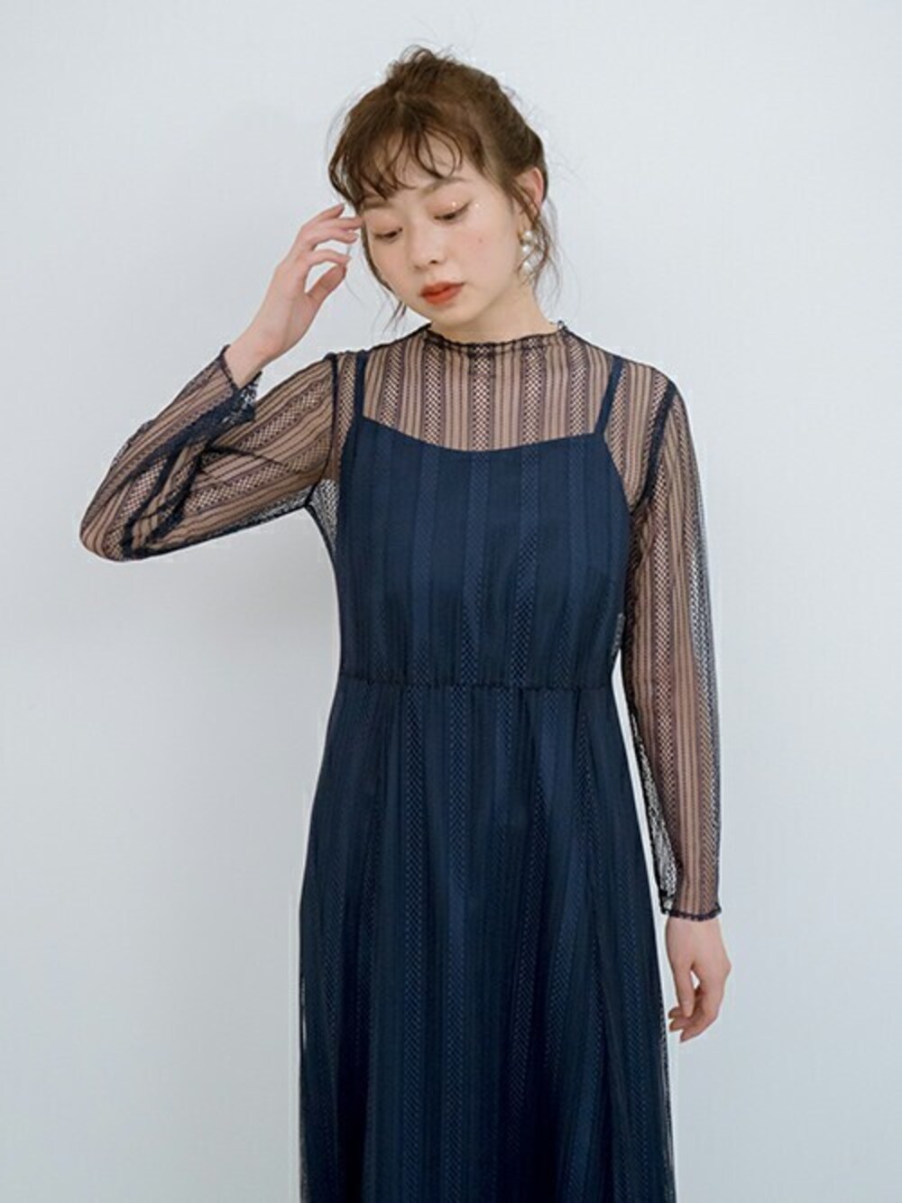 繊細なハシゴレースを全面に使用したワンピース。 花柄や甘い柄が得意ではない方にもおすすめな、めずらしい刺繍柄です♪ 上品な透け感と、シックな色味で大人っぽい印象に。 結婚式や二次会などのお呼ばれドレスとして、またお食事会などのセミフォーマルシーンにもオススメです。