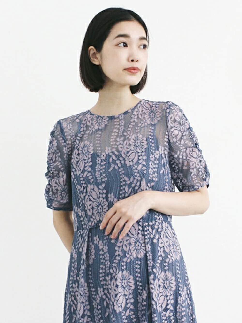 sax×pinkの配色が美しい、羽織り要らずの袖付きレースワンピース。 袖にギャザーが入っているので、より柔らかく女性らしい印象に。 レースの華やかさと落ち着いた色味が、結婚式などのお呼ばれにはもちろん、特別な日におすすめです。