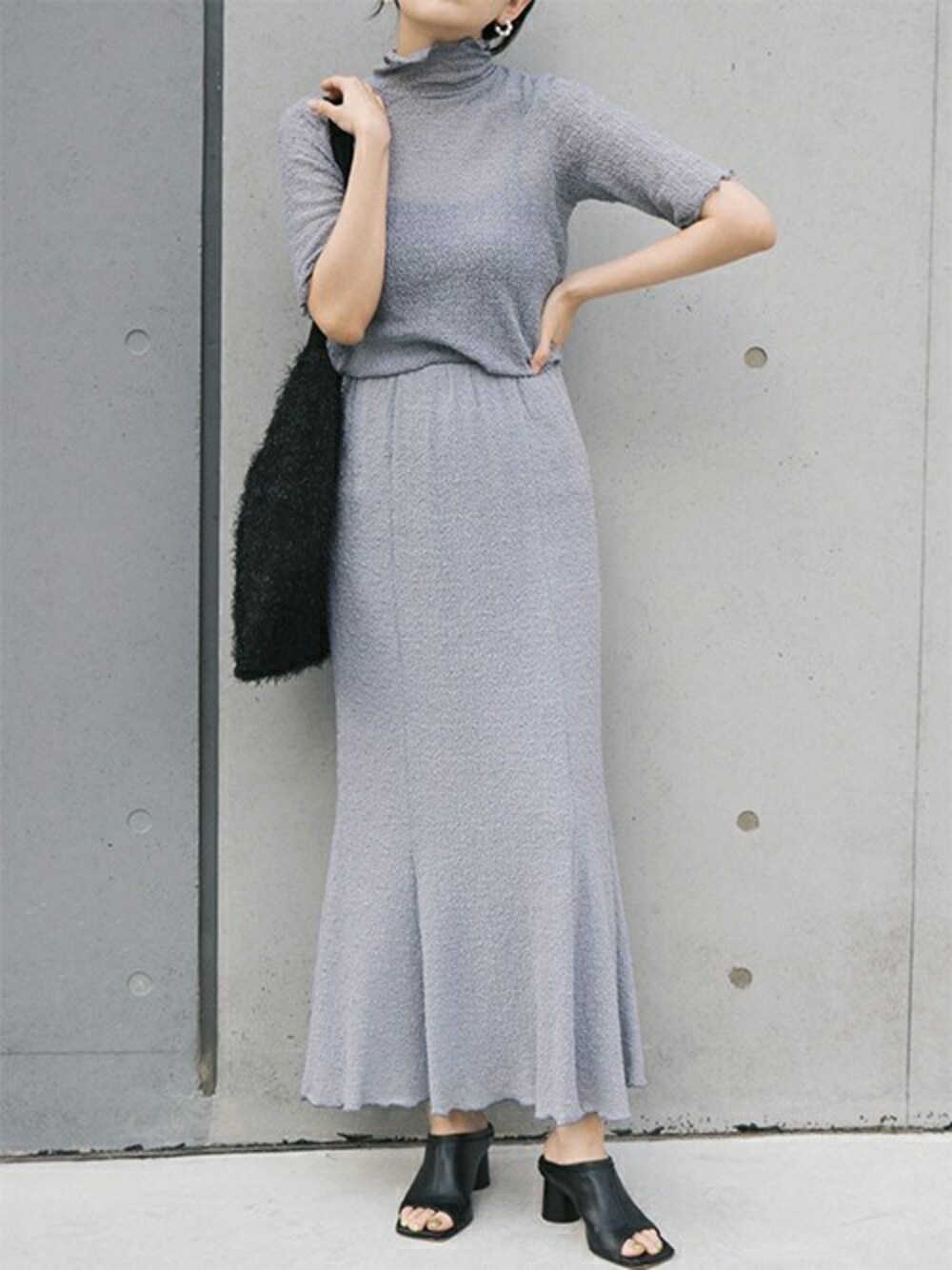 シュリンクレース(ふくれジャガード生地)を使用したセットアップ。 ストレッチが効いていて伸縮性があるので、着用も楽チン。 リラックスしてご着用いただけます。 ブラウスは衿ぐりに高さを出して、後ろ襟もとにはクルミ釦を数個オン。 顔まわりを華やかに仕上げました。 スカートはマーメイドシルエットで、体のラインをすっきりと美しくみせます。 トップスはインでもアウトでもバランスのよい着丈感です。 上下別々に着用できるので、コーディネートの幅も広がります。 結婚式やパーティーはもちろん、日常使いにも着回しやすいアイテムです。 ラメジャガード2wayバッグ▶coming soon....