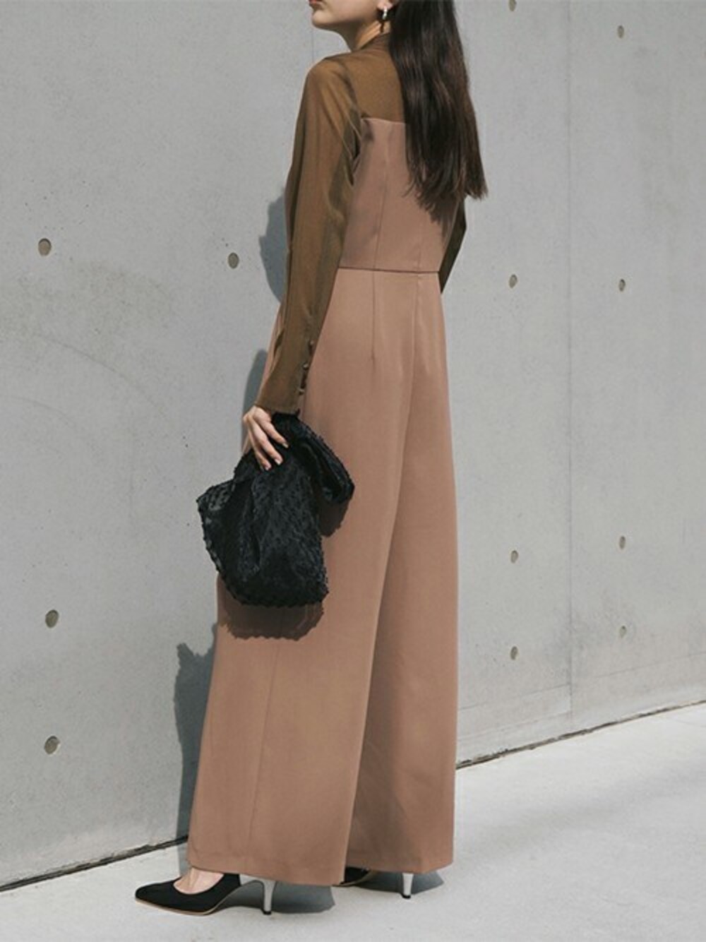 透けすぎないシアーな生地と、ツイル生地を組み合わせたオールインワン。 シンプルながら、身体のラインを綺麗に見せるシルエットにこだわりました。 ワイドパンツと、パンツのセンタータックが 身体の縦のラインを強調し、スタイルアップ効果バツグン。 袖口のくるみボタンがポイントです。 結婚式や二次会などのパーティーにはもちろん、お食事会などのお出かけにもおすすめです。 ▼着用アイテム ドットオーガンジードッキングハンドバッグ/040081 バイカラーパンプス / 050014