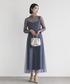 ※NEW COLOR sax !! 襟ぐりのメロウ加工とすっきりとしたフレアースカートのボリューム感が甘すぎない、大人のチュールワンピース。 さりげないラメ素材は伸縮性が良く、肌触りの良いワンランク上の日本製チュールを使用。着心地も快適です。 結婚式や二次会などのお呼ばれドレスとして、またお食事会などのセミフォーマルなシーンでもオススメです。