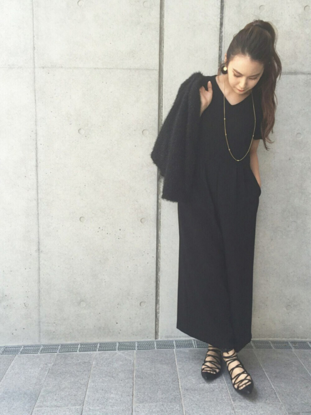 シーズンレスな素材が嬉しいこちらのオールインワンは、しっかり袖がついているのも嬉しいポイントです。 シンプルなデザインだからこそ、素材やシルエットの美しさが光ります。 シャギーカーディガンを合わせて、秋っぽさもプラス。