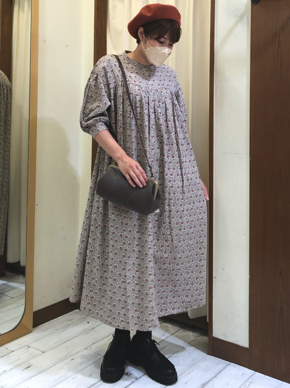 初秋コーデ 秋らしい色の花柄ワンピースにオレンジのベレー帽を合わせました! 羽織としても使えますし、したりパンツやスカート入れてあげても可愛く着こなせます✨️ がま口バッグは容量多めです! 靴はコンフォートやストラップシューズ合わせてあげると秋らしくとてもいいですね✌️