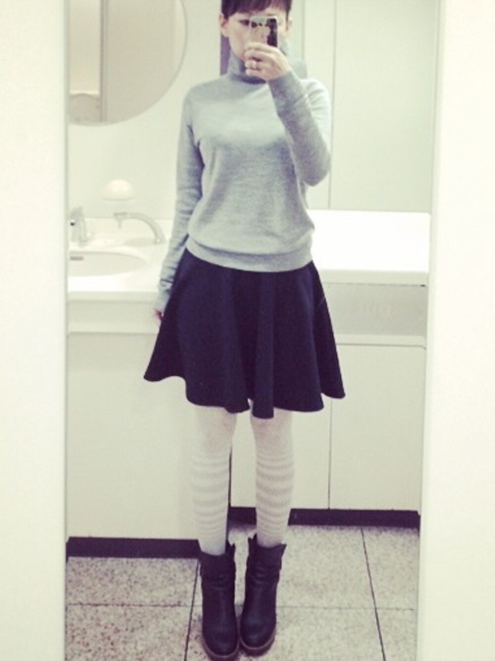 タートルはユニクロ。 タイツはアンティパスト。 幅が違うシマシマでかわいい。