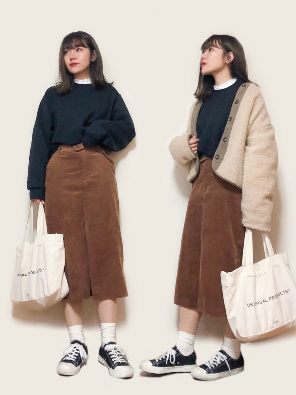 コーデュロイのタイトスカートに メンズのスウェットを合わせて カジュアルに着ました。 スウェットの下には 首フリルのブラウスをイン❤︎ instagram▶︎▶︎@xxokohakxx