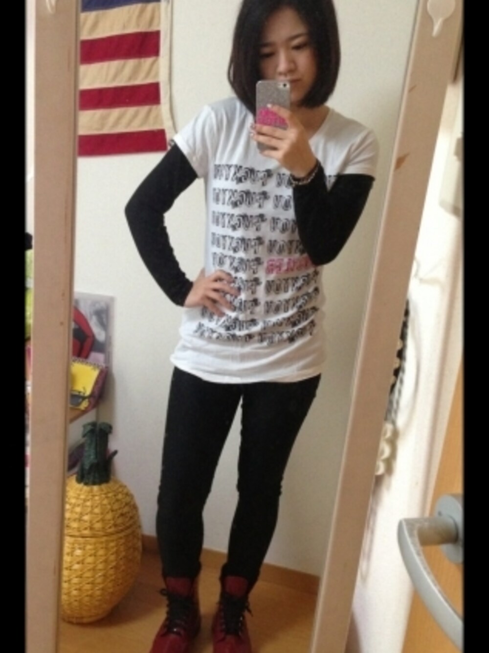 FUCK YOU coordinate 今日ゎめっちゃあったかそうだからロンTの上にTシャツ合わせただけっ! ポイントゎ赤のレインブーツです!笑 雨ゎ降ってないけど履きたいの!笑