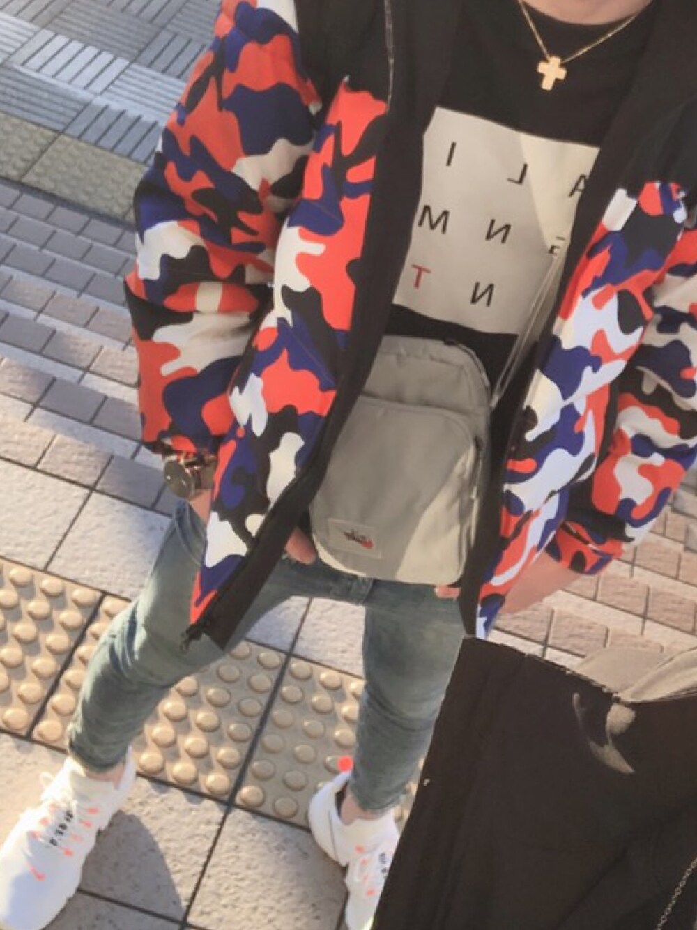 コンセプトは目立ってなんぼ😌 目立ちたがりの自分にはぴったりな上に 暖かくてgood🙆♂️ スニーカーは白基調にオレンジ入れてアウターと色味を似せました🤭