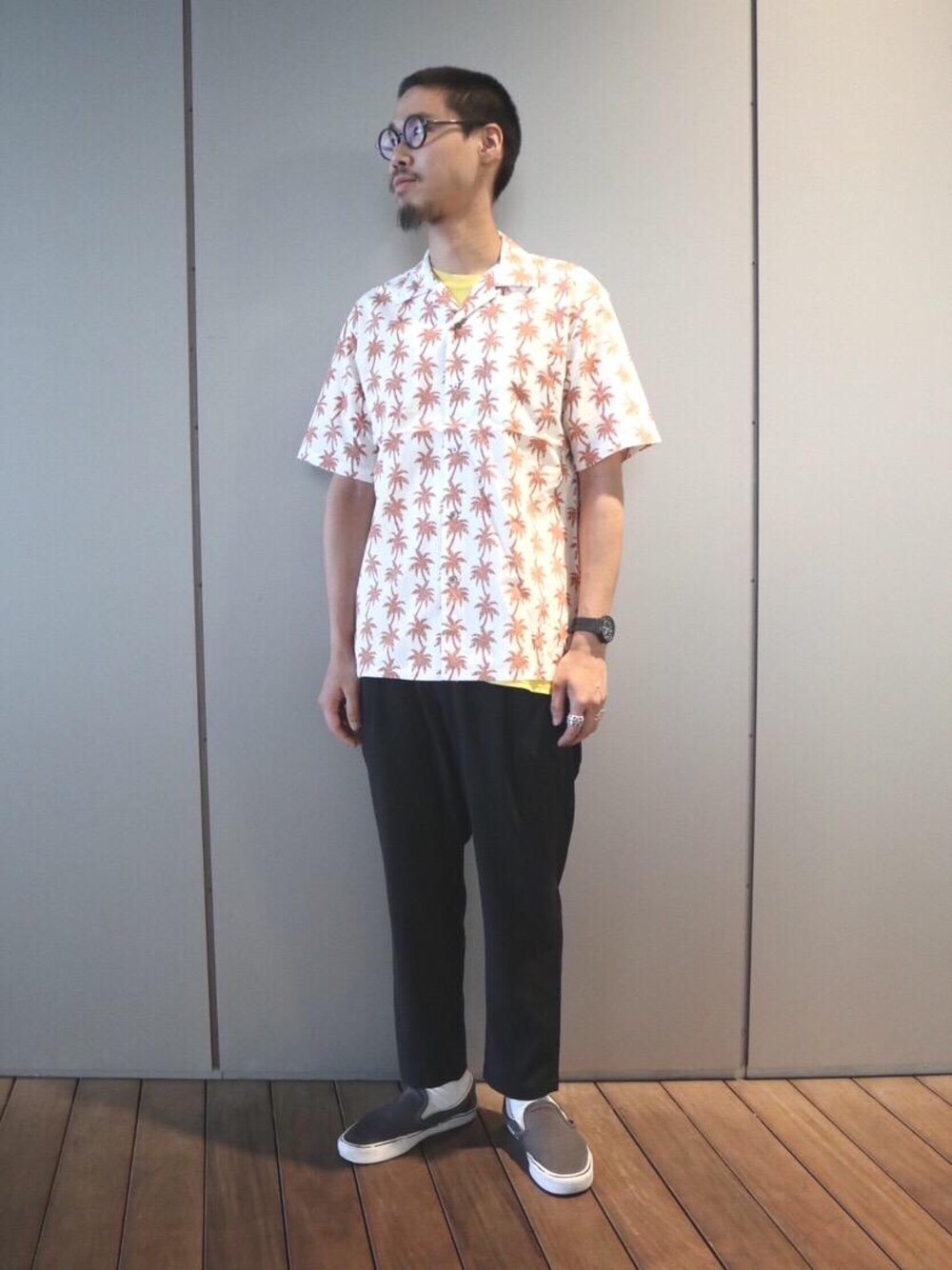 reyn spooner のハワイアンシャツをシンプルに合わせた大人リゾートスタイル。パンツはブラックのイージーパンツで動きやすく、ハリもあり綺麗目な印象。リゾート感を強く感じさせない合わせがポイントです。 シャツ size:M パンツ size:M