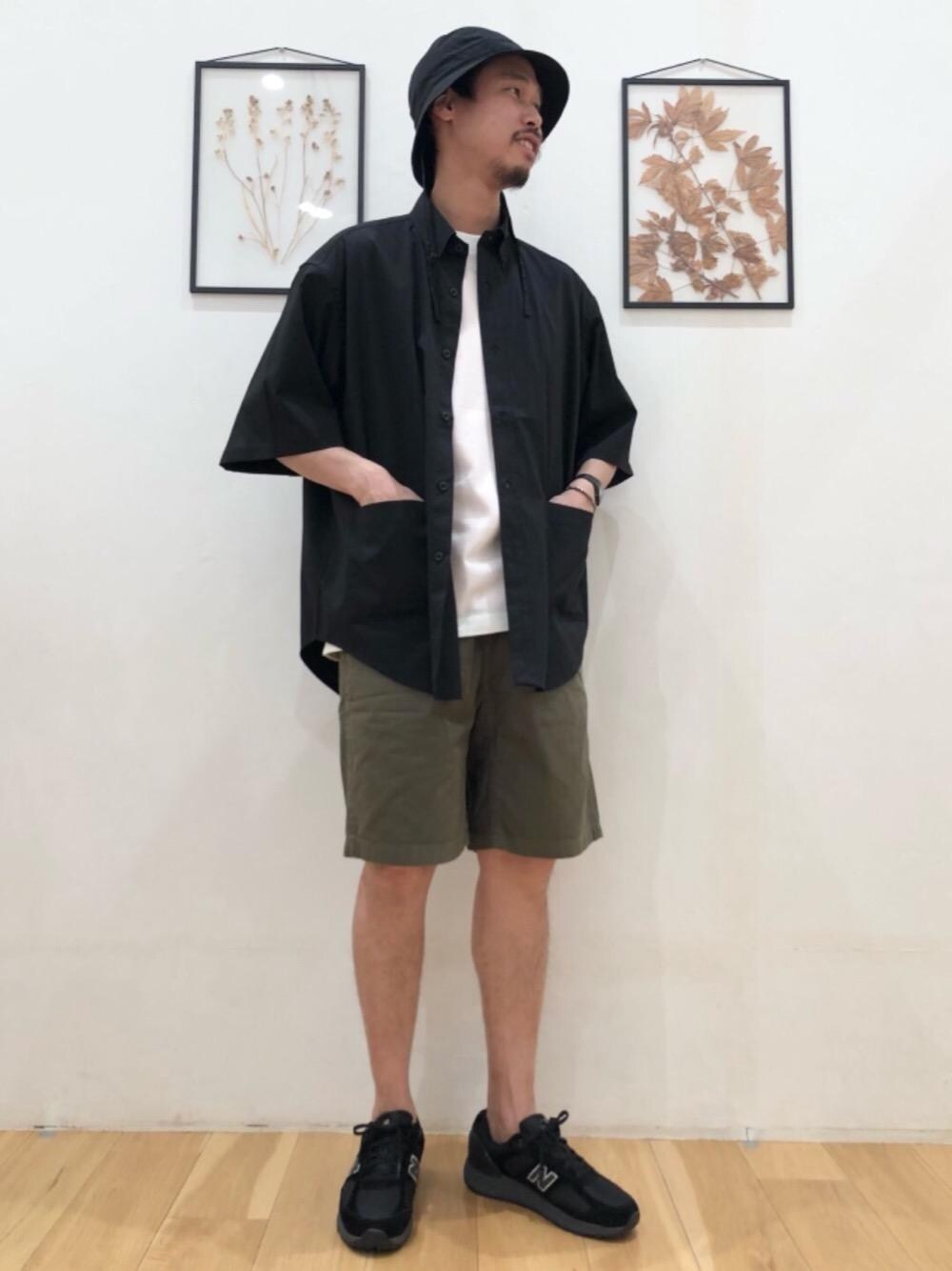 身長:178センチ シャツ:L パンツ:L シューズ:27.5センチ ブラックとオリーブの落ち着いた色の組み合わせですが、ざっくりしたシャツにショートパンツで夏らしくまとめました。