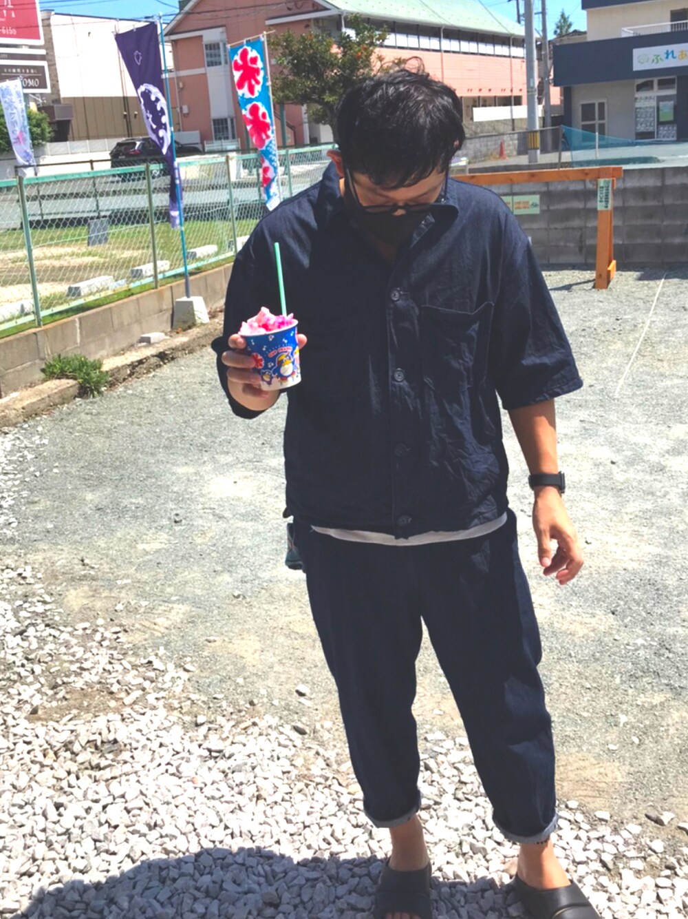 guのデニムシェフシャツジャケットと デニムバルーンパンツでセットアップコーデ グローバルワークのレイヤードタンクトップが良い仕事してます!