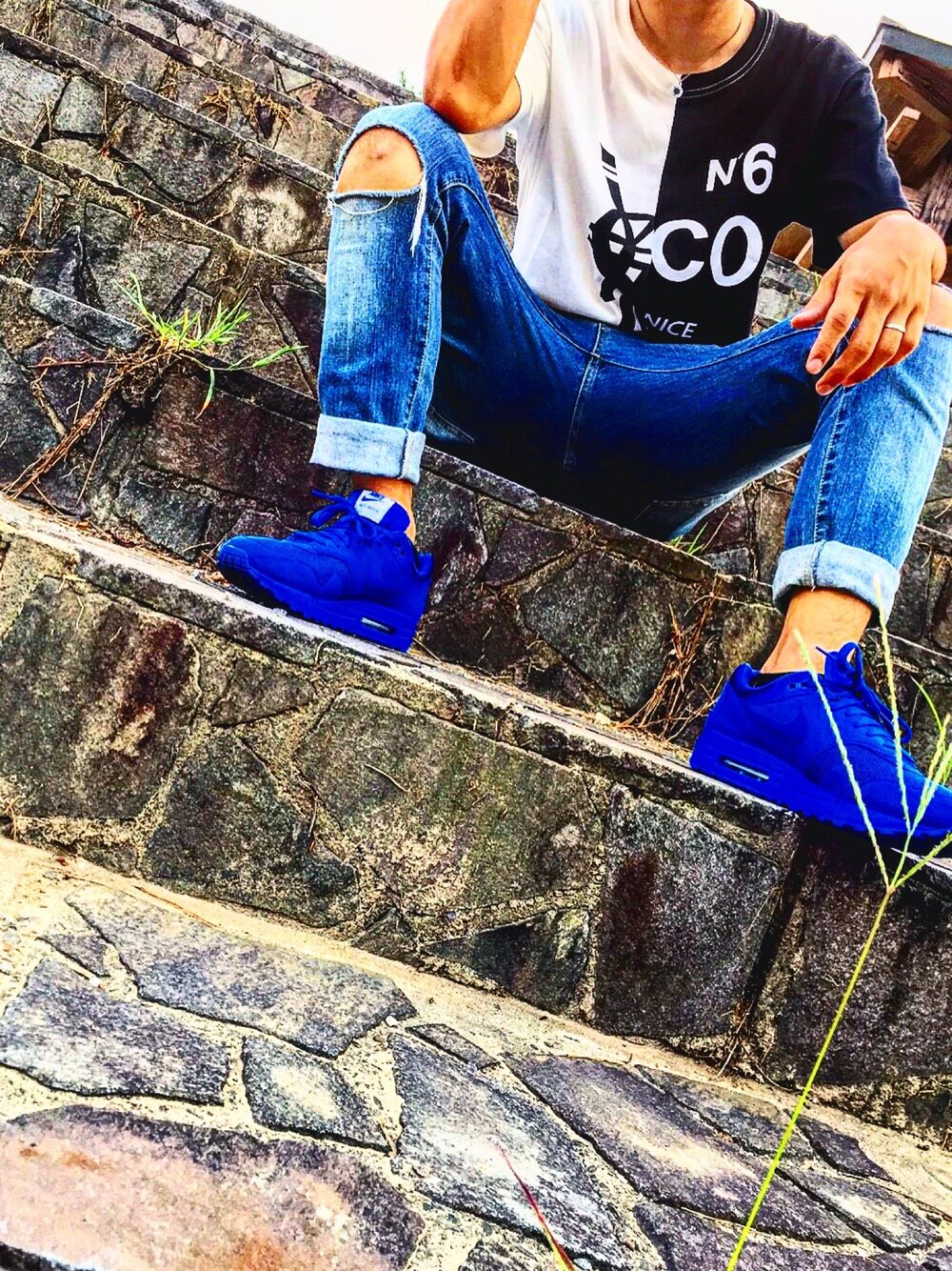 念願のエアマックスの青手に入りました🙆 被らないのですごく気に入りましたが合わせかたが難しい色ですね青って😓