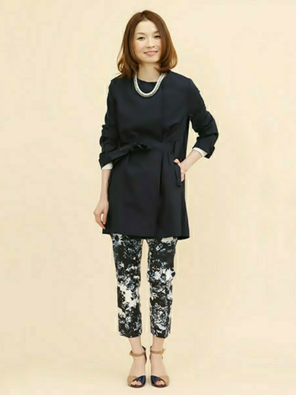 コットンナイロンのデイリーユースコートをトレンド最前線のフラワープリントパンツと合わせました。