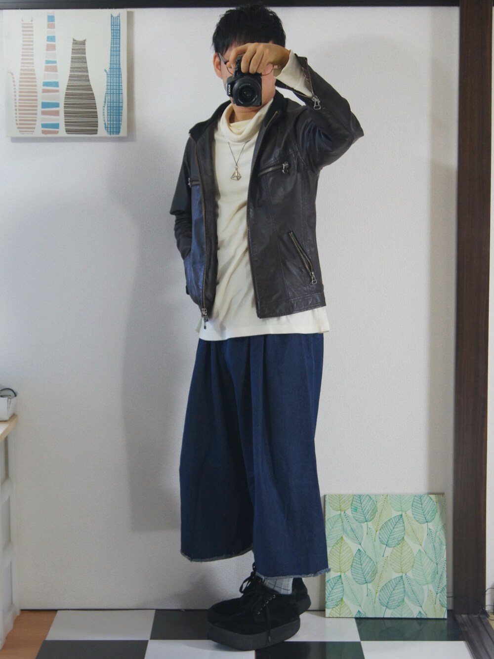 タートルネックのTシャツとライダースとワイドパンツ 服のサイズ感だけこだわって後はシンプル、シンプルに……