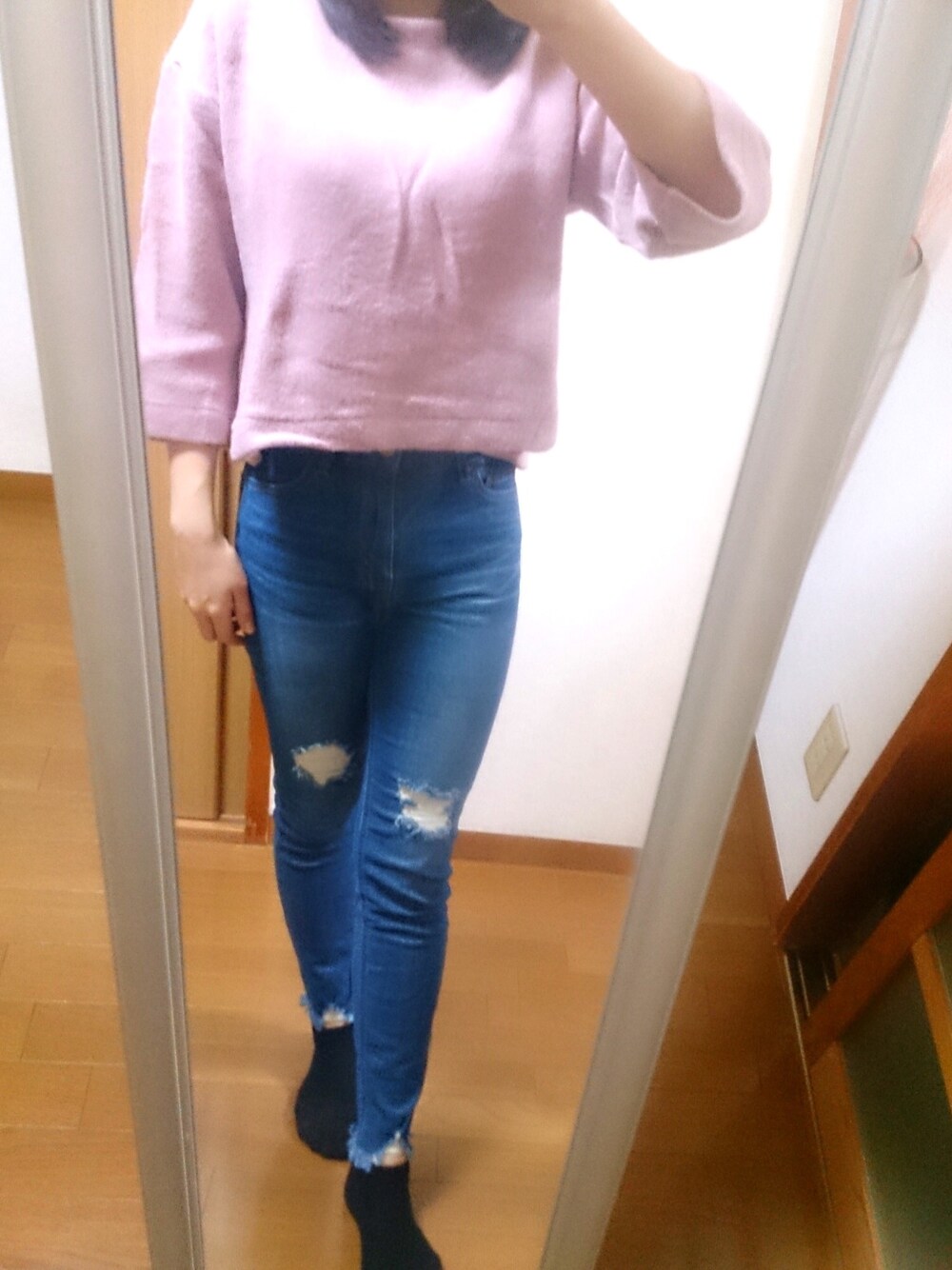 Rinaのデニムパンツ「m クラッシュスキニーデニム」を使ったコーディネート