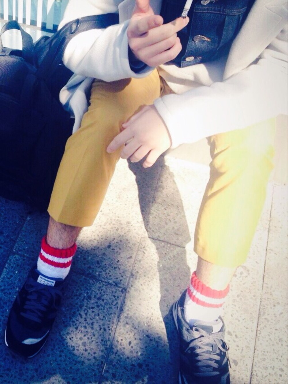 コート 不明 デニムジャケット A.P.C. パンツ soe ソックス ユニバーサルプロダクツ スカイツリーにいった時の写真。